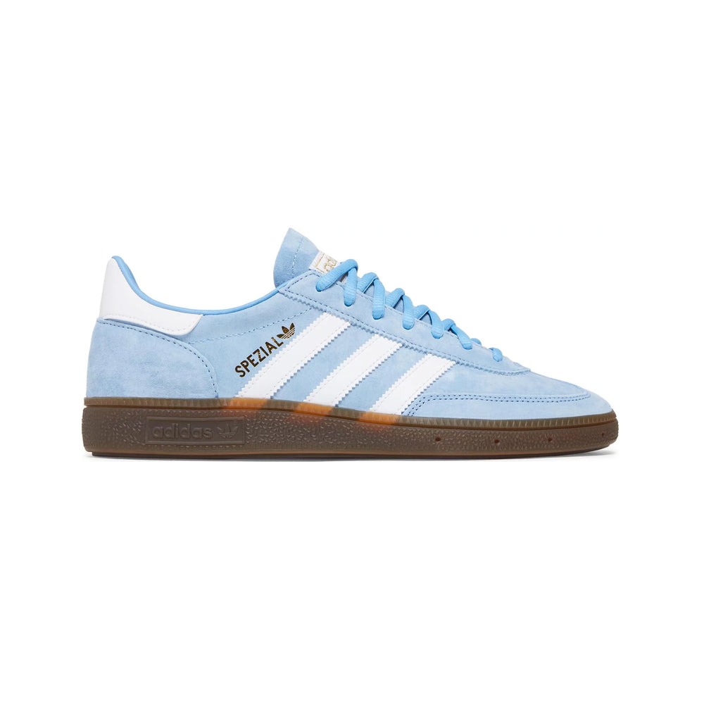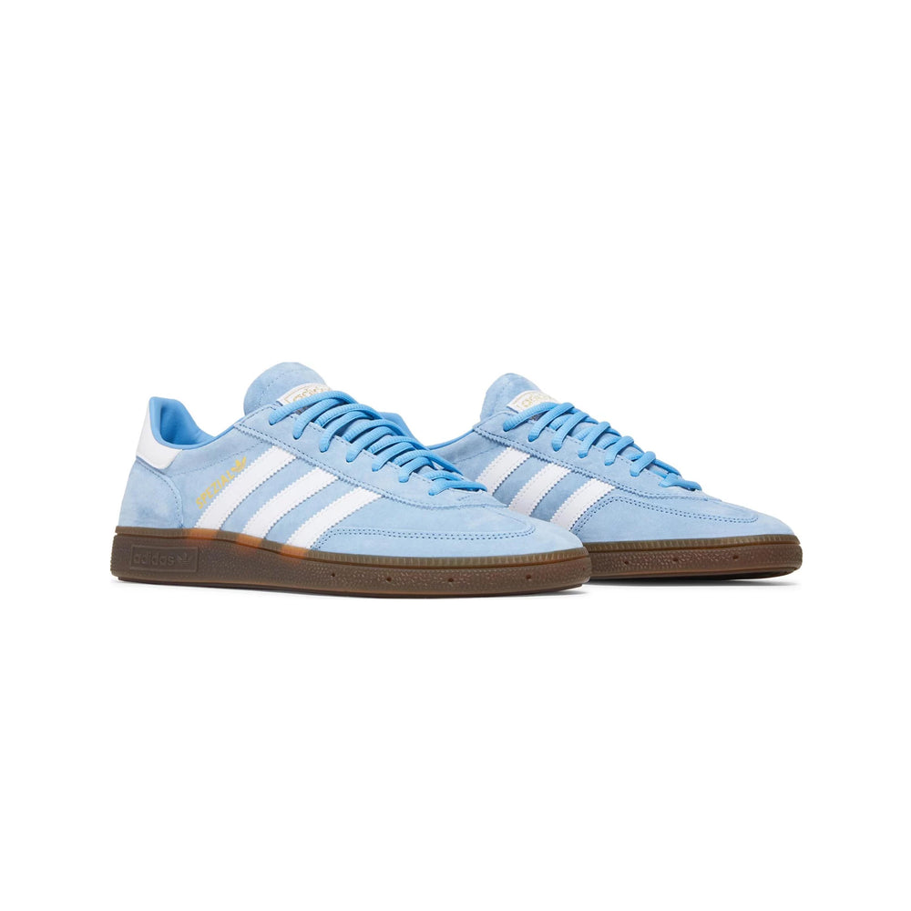 Crafted from premium light blue suede, the upper of the Handball Spezial 'Light Blue' exudes a soft, luxurious feel while ensuring optimal durability. The iconic three stripes, rendered in a contrasting white leather, accentuate the sneaker's sleek profile and pay homage to Adidas' heritage. A gum rubber outsole not only enhances traction and stability but also adds a vintage touch that resonates with both sports enthusiasts and casual wearers alike.