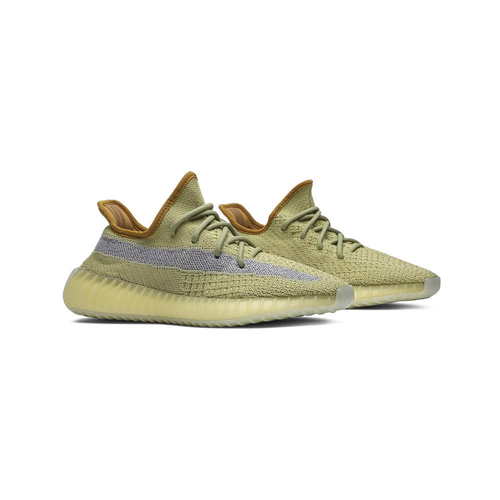 The Yeezy Boost 350 V2 'Marsh' features a Primeknit upper in a muted mustard-yellow hue, offering both breathability and a snug, adaptive fit. The design is accented by a contrasting brown stripe running along the lateral side, adding a subtle touch of depth to the overall aesthetic. The sneaker’s full-length Boost midsole, encapsulated in a semi-translucent rubber shell, ensures superior cushioning and responsiveness, making it ideal for both style and comfort. A light gum outsole completes the look, enhancing traction while contributing to the earthy tones of the shoe. The pull tab at the heel is omitted in this iteration, providing a streamlined silhouette.