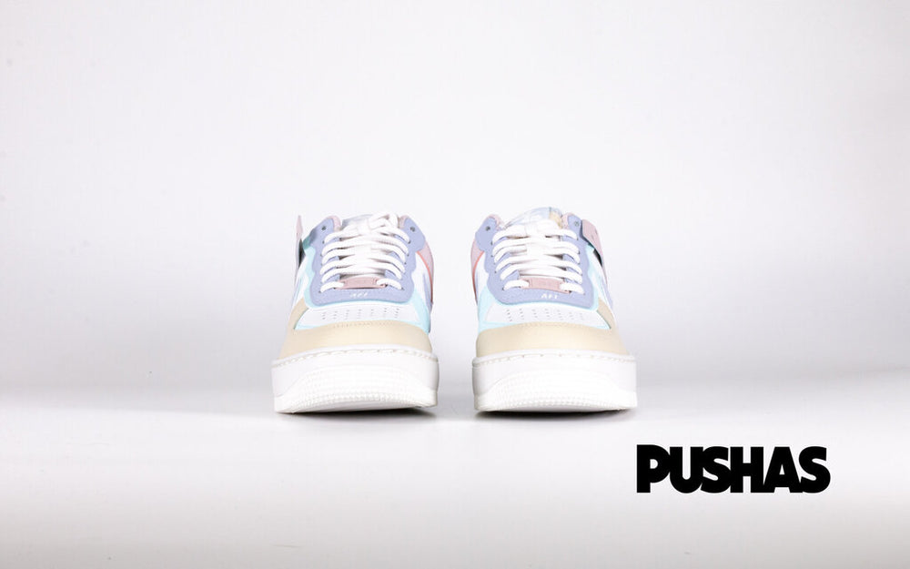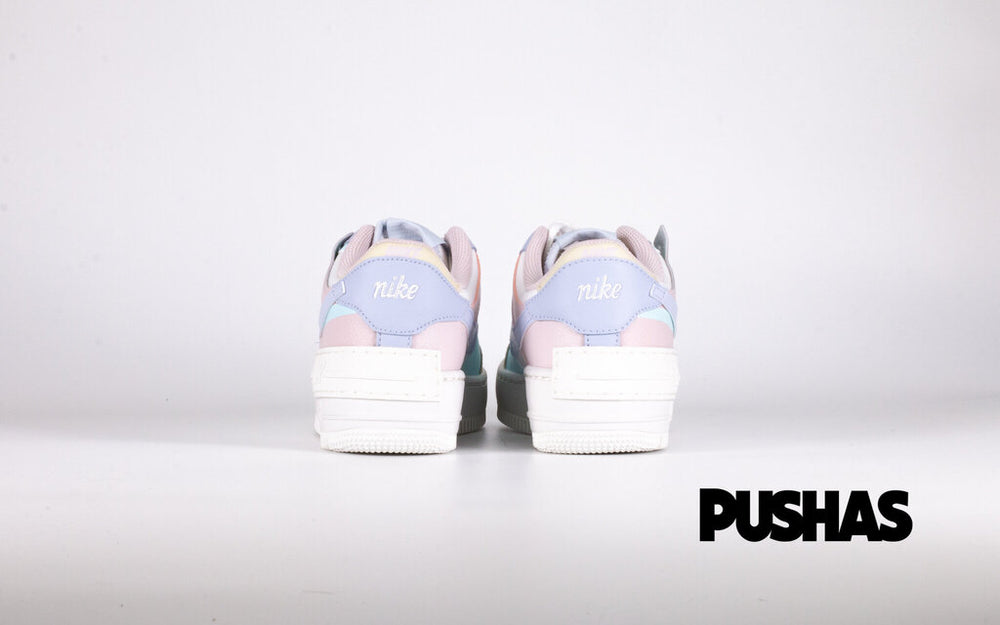 The Women's Nike Air Force 1 Shadow White Glacier Blue Ghost features a delicate colour scheme with edges that bridge across the upper in appealing ways. Nike creates a muted appearance by combining the complementary hues of pink, purple, yellow, and blue with a white basis. The design has distinct raised borders on the toe cap, logo, and eye stay as well as one-of-a-kind, layered wrappings of the Air Force 1 on the heel. With a subtle purple hue that contrasts with the surrounding collar, the lining maintains the color-blocking appearance.
