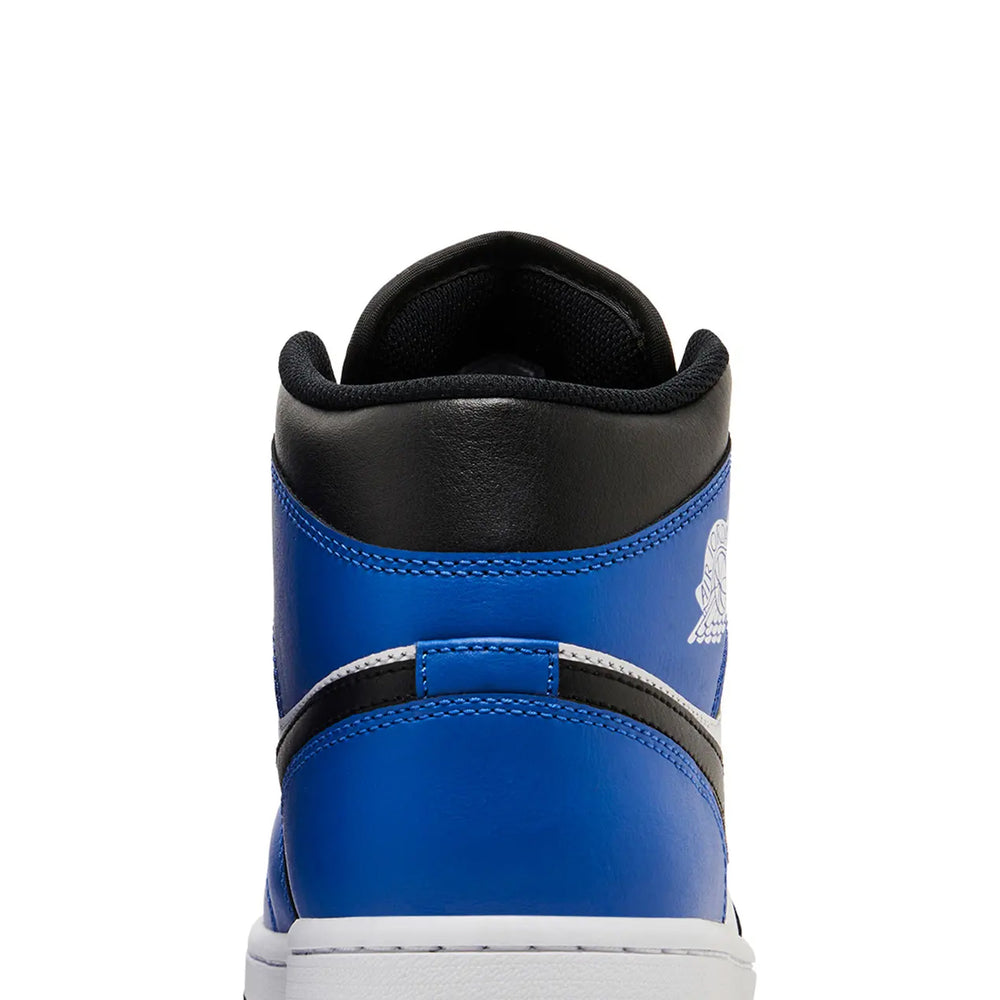 The Air Jordan 1 Mid 'Game Royal' features a smooth white leather base, accentuated by striking Game Royal overlays that extend from the forefoot to the heel. The iconic Nike Swoosh, rendered in deep black, provides a sharp contrast, harmonizing with the black collar and laces. Completing the design, a white midsole paired with a Game Royal rubber outsole ensures comfort and durability, staying true to the Air Jordan 1's heritage. Designed for versatility, this colorway embodies the spirit of basketball culture and streetwear aesthetics, making it a statement piece in any sneaker collection.