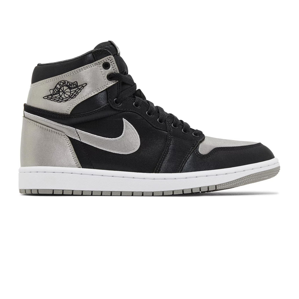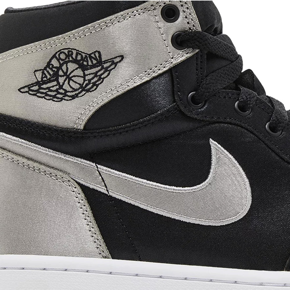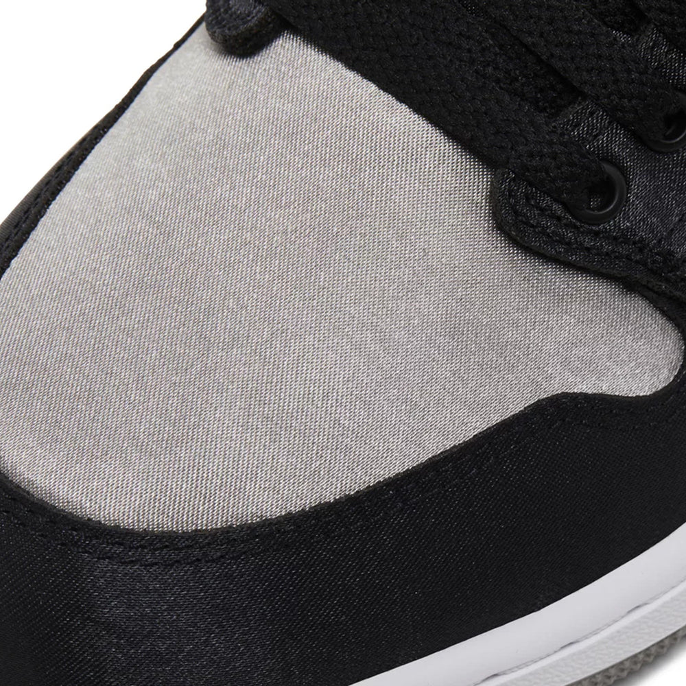 The Air Jordan 1 Retro High OG 'Satin Shadow' Women's (2024) reimagines the iconic 'Shadow' colorway with luxurious satin accents. The upper is crafted from a combination of black leather and satin, offering a sleek, glossy finish that contrasts beautifully with grey leather overlays on the toe box, collar, and heel. The Nike Swoosh is subtly embroidered in black, blending seamlessly with the overall design. The sneaker maintains its OG detailing, such as the "Wings" logo on the ankle and the Nike Air tongue tag, but the satin construction introduces a new level of sophistication. The mix of leather and satin not only enhances the visual appeal but also adds a plush, comfortable feel for daily wear.