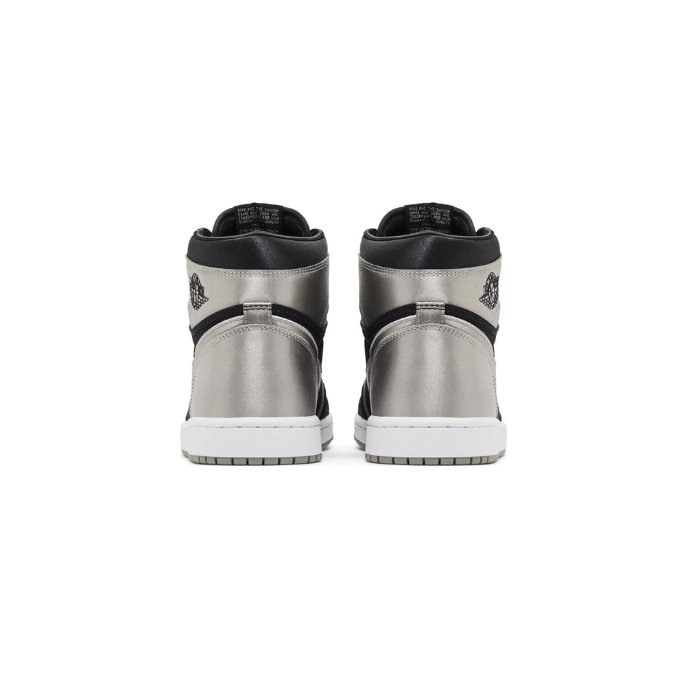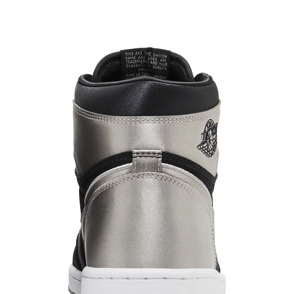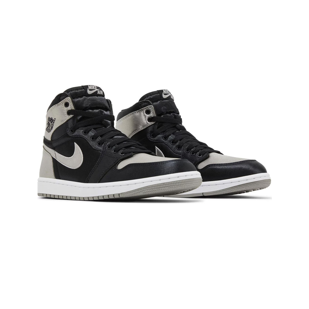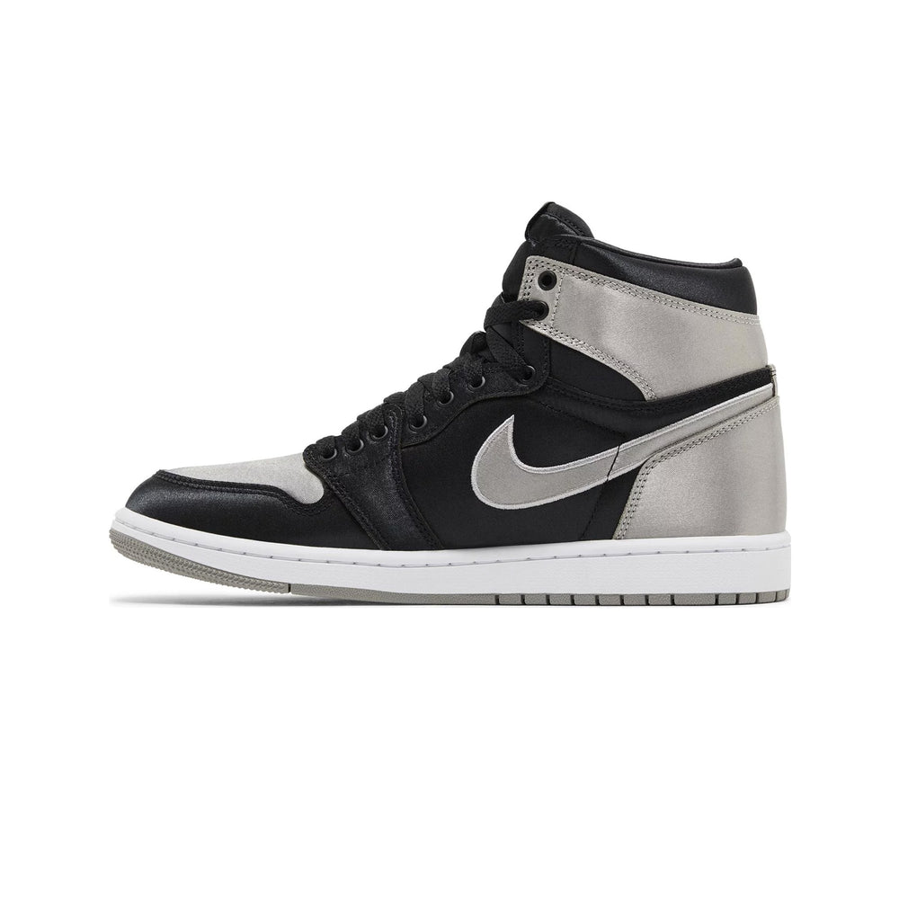 The Air Jordan 1 Retro High OG 'Satin Shadow' Women's (2024) reimagines the iconic 'Shadow' colorway with luxurious satin accents. The upper is crafted from a combination of black leather and satin, offering a sleek, glossy finish that contrasts beautifully with grey leather overlays on the toe box, collar, and heel. The Nike Swoosh is subtly embroidered in black, blending seamlessly with the overall design. The sneaker maintains its OG detailing, such as the "Wings" logo on the ankle and the Nike Air tongue tag, but the satin construction introduces a new level of sophistication. The mix of leather and satin not only enhances the visual appeal but also adds a plush, comfortable feel for daily wear.