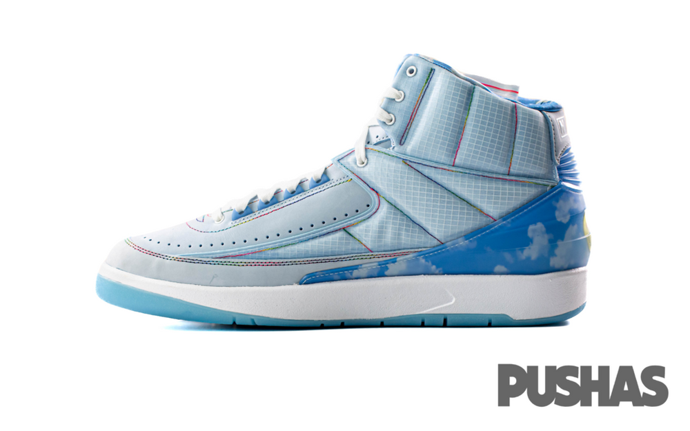 This offering of the J Balvin x Air Jordan 2 features a padded-style upper with LED detailing and glow-in-the-dark rubber outsole. Other details includes cloud graphics on the heels and lining, personal branding on the inner tongues and signature smiley face motif on the heels.