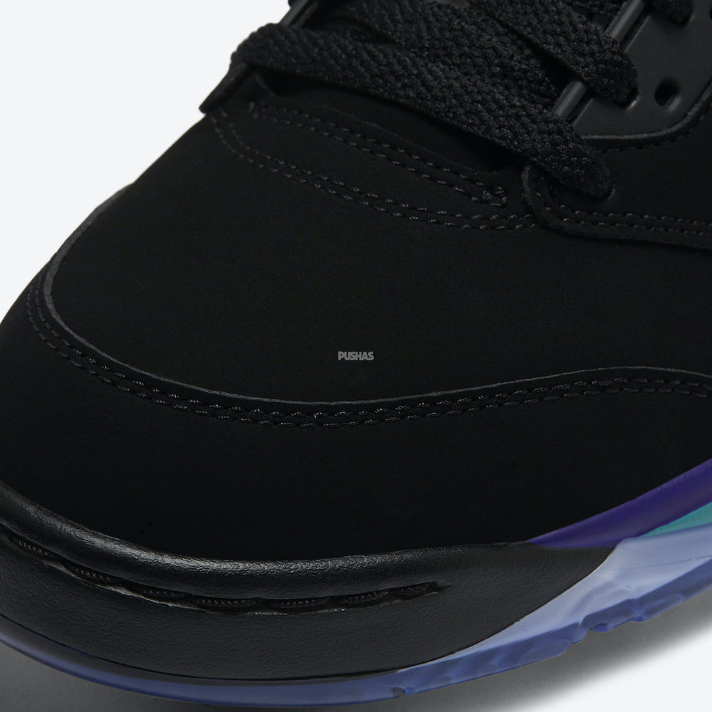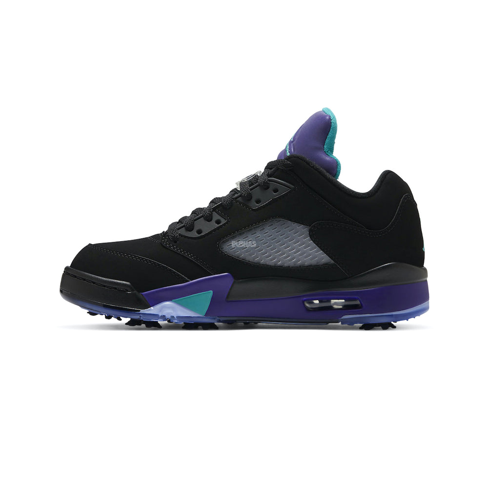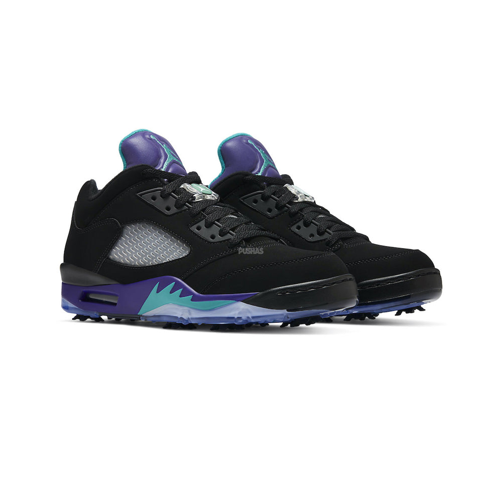 Introducing the epitome of style and performance on the green: the Air Jordan 5 Retro Low Golf 'Black Grape' (2020). Crafted with the precision and innovation synonymous with the Air Jordan brand, this golf shoe seamlessly blends iconic design with cutting-edge technology for the ultimate golfing experience. Paying homage to the classic 'Black Grape' colorway, this iteration features a sleek black upper with pops of grape and emerald accents, delivering a look that exudes sophistication and flair.