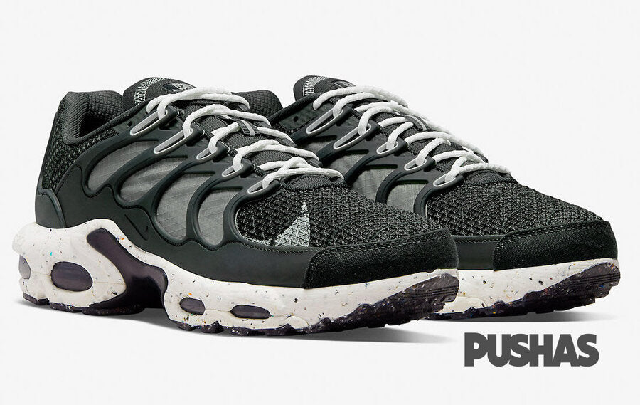 This new, easily wearable Nike Air Max Terrascape Plus colourway features uncomplicated colour blocking. This customized version of the Nike Air Max Plus features an outsole made with 10% Nike Grind, a substance that Nike creates from recycled shoes and industrial waste, and an upper made of recycled polyester. This pair has a mesh top, a TPU cage that is attached to the side panels, canvas accents on the toe and heel, a plastic heel, and big Swooshes on the side panels. The majority of the colourway is predominantly black, with contrasting white accents appearing on the laces and midsoles with speckles.