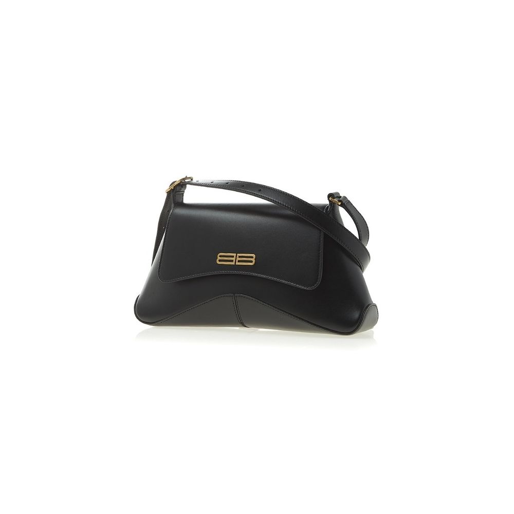 Step into the world of Balenciaga with the Black Leather Crossbody Bag, where elegance meets edgy sophistication. Crafted from smooth calfskin leather, this bag boasts a sleek crescent design that's both modern and timeless. This exquisite piece is adorned with antiqued gold hardware that adds a vintage touch, complemented by a metal brand logo that sits proudly on the front, proclaiming its luxury heritage. Functional as well as fashionable, the bag features a fixed and adjustable shoulder strap, providing versatile wear options to suit any style. Within, an interior zipper pocket keeps your essentials secure and organized. Meticulously made in Italy, this Balenciaga crossbody bag's dimensions are a perfect 32x16x6 cm, offering ample space in a refined silhouette. This isn't just a bag—it's a statement, a 100% leather testament to Balenciaga's commitment to impeccable style and craftsmanship.