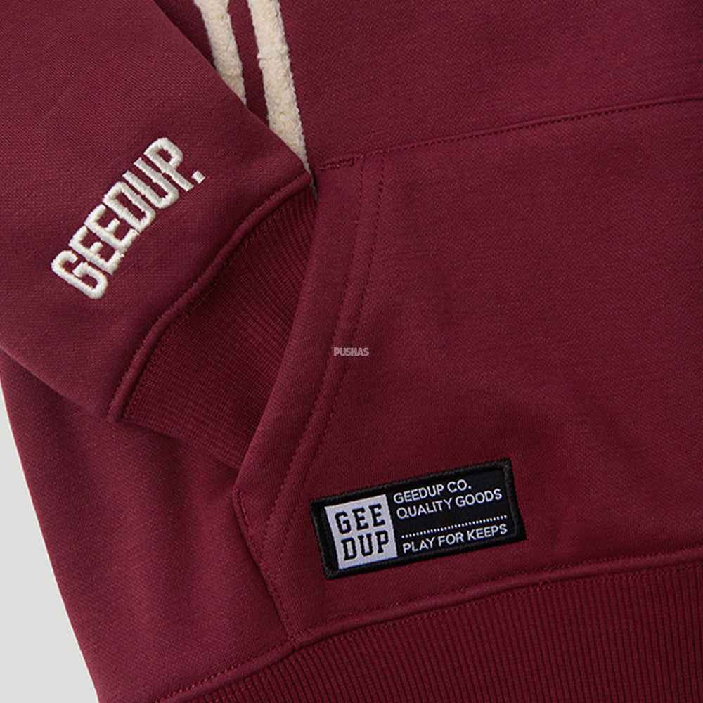 Overview Crafted from high-quality cotton and polyester blend, the Geedup Handstyle Kids Tracksuit 'Maroon / Cream' offers exceptional softness and flexibility. The maroon top features a full zip closure and a high collar for added warmth, adorned with cream accents on the sleeves and zipper lining. The matching maroon pants include an elastic waistband and adjustable drawstrings, providing a secure fit for all-day comfort. Both pieces are detailed with Geedup’s signature branding, ensuring that style is never compromised. This tracksuit is not just about aesthetics; it's designed to withstand the rigors of everyday play while keeping kids stylishly on-trend.
