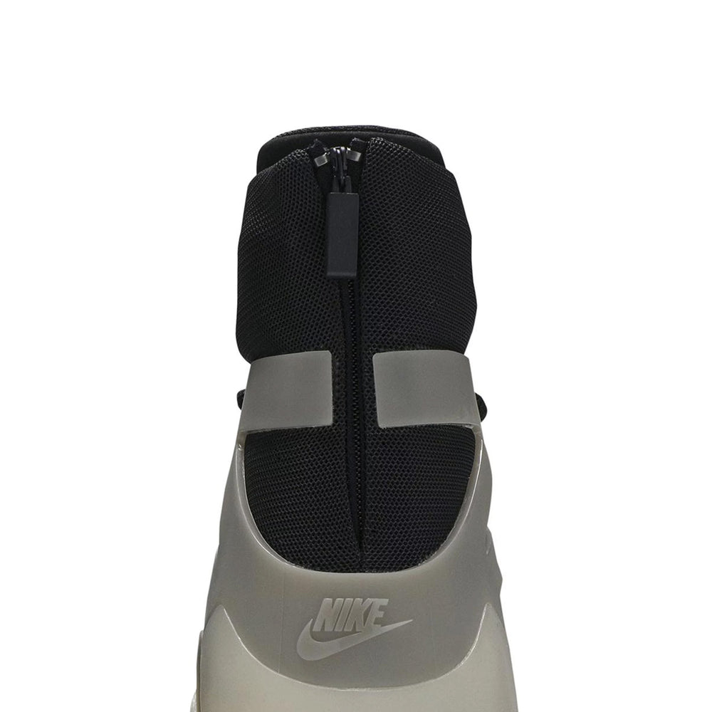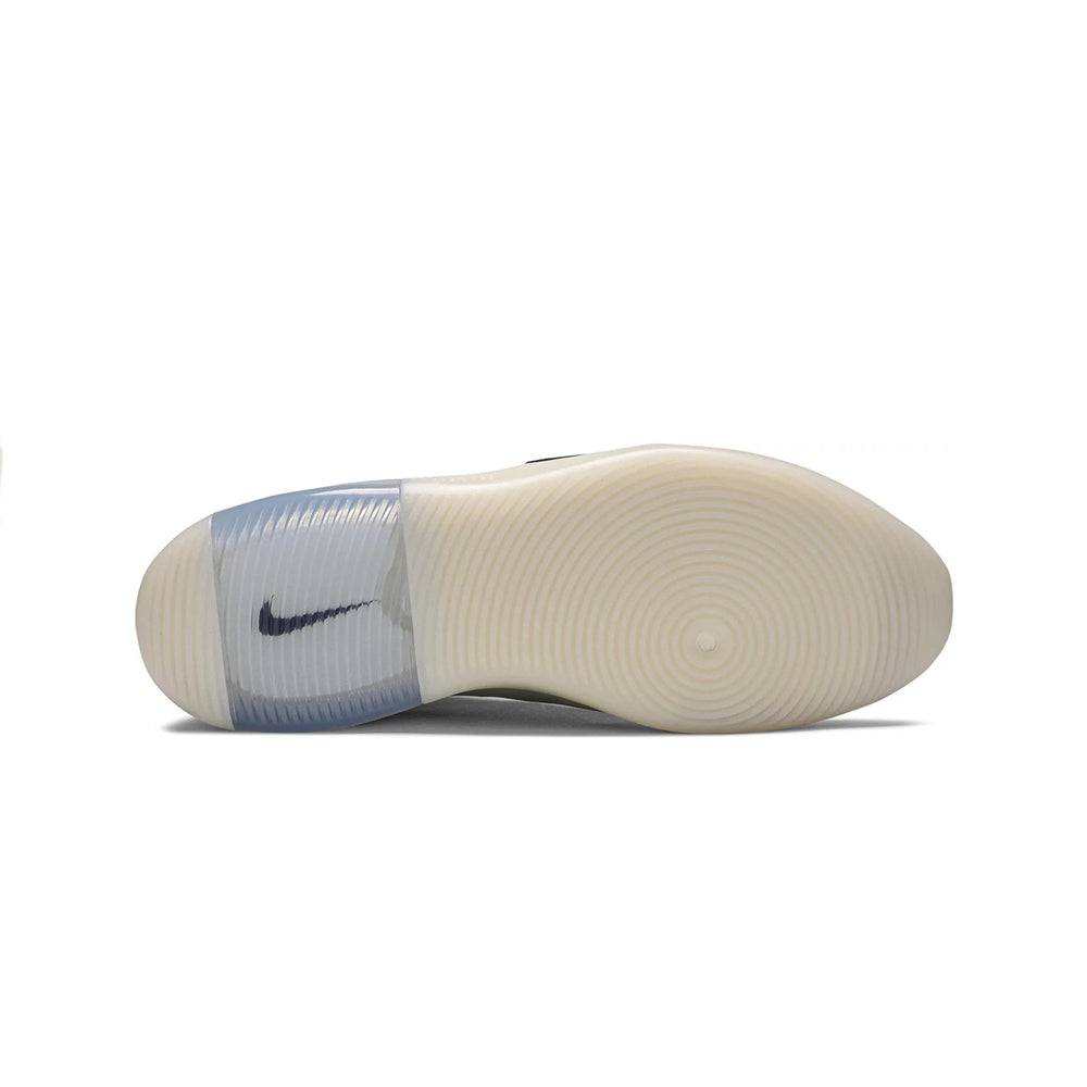 The Nike Air Fear of God 1 'String The Question' features a minimalist yet impactful design, highlighted by its premium materials and attention to detail. The upper is constructed from a mix of high-quality suede and mesh, providing both durability and breathability. The "String" beige hue dominates the shoe, offering a versatile, neutral base that complements any outfit. This is contrasted by the black TPU cage, which not only adds structural integrity but also echoes the design of the classic Huarache Light, another iconic Nike model. The midsole is equipped with a double-stacked Zoom Air unit, ensuring superior cushioning and responsiveness, essential for both on-court performance and off-court style. The sneaker is completed with a thick, sculpted sole that underscores its modern aesthetic while providing optimal support.