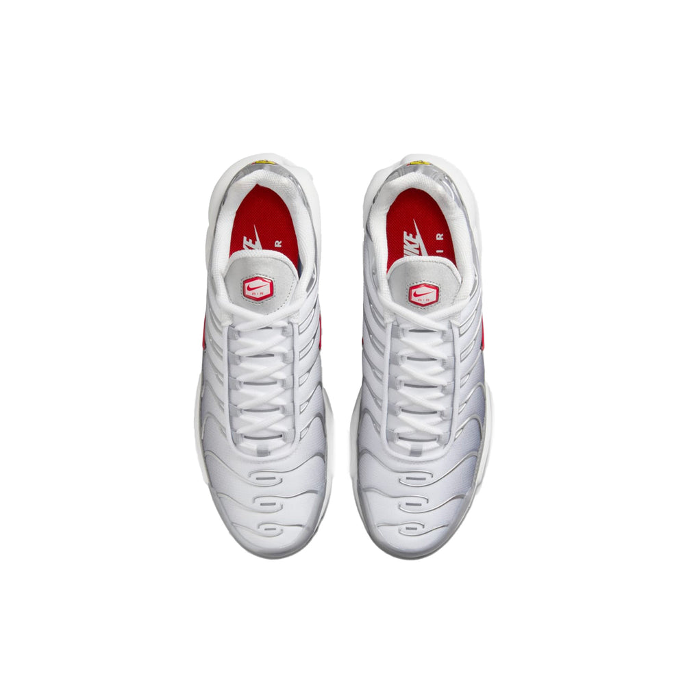 The Nike Air Max Plus TN 'Silver Bullet' features a dynamic silver mesh upper complemented by reflective overlays that capture light from every angle, enhancing its striking visual appeal. The shoe's design is further elevated by the signature wavy TPU accents that provide structural support and a futuristic look. The midsole houses the revolutionary Tuned Air technology, delivering tailored cushioning and superior impact protection. A bold red Swoosh adds a pop of color, standing out against the metallic backdrop. The black rubber outsole, with its durable traction pattern, ensures stability and grip, making it ideal for both athletic endeavors and streetwear style.