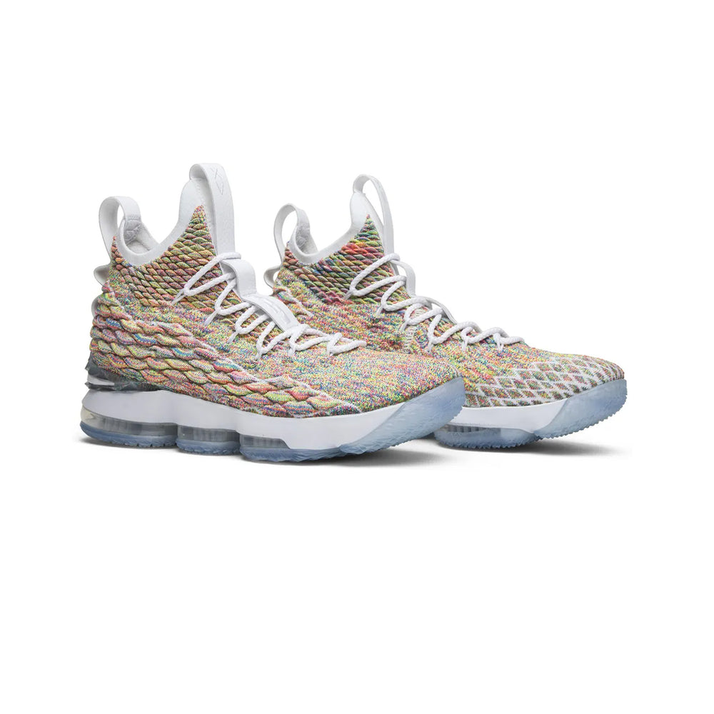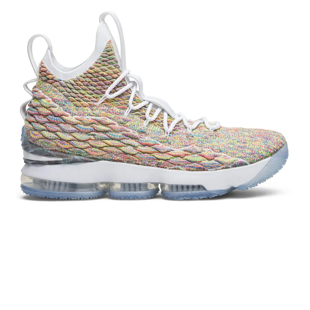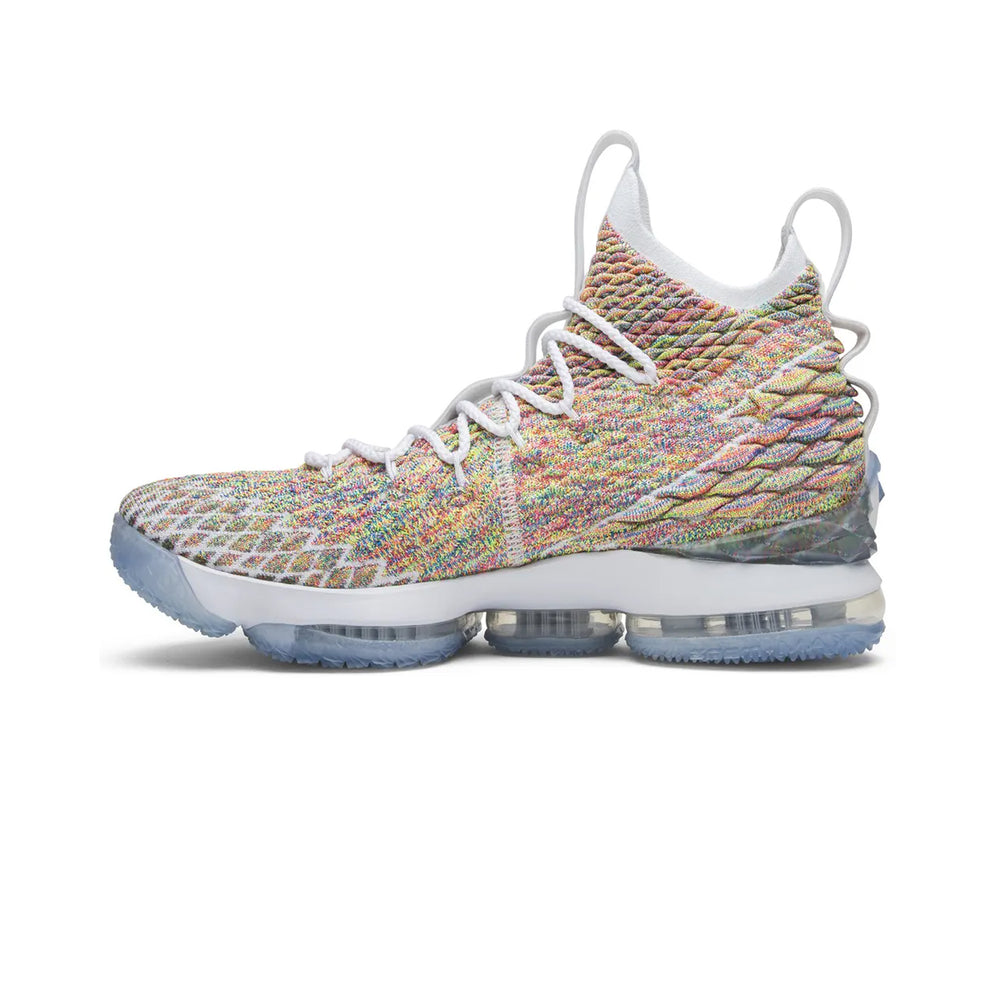 The Nike LeBron 15 'Fruity Pebbles' takes inspiration from the vivid hues of the Fruity Pebbles cereal box, showcasing a mix of bright, energetic tones across its Battleknit upper. The sneaker boasts an iridescent finish that reflects the playful, multi-colored elements of the cereal, with hits of orange, green, and purple spreading across the dynamic knit construction. The design incorporates a bold, eye-catching combination of premium materials, including a smooth, glossy midsole and a translucent outsole for a futuristic look. The signature Zoom Air cushioning in the forefoot and the Max Air unit in the heel deliver LeBron’s signature on-court comfort and support, making this sneaker as functional as it is stylish.