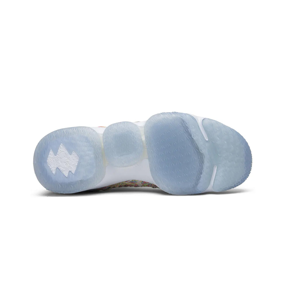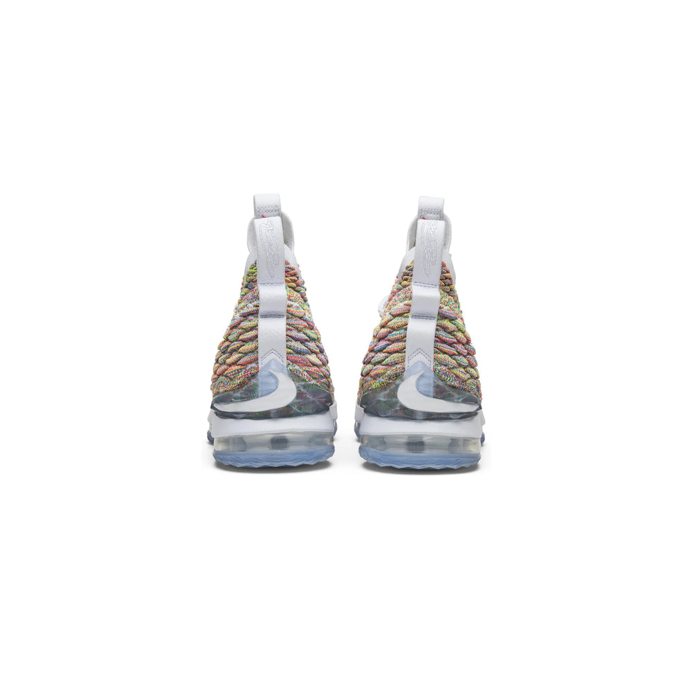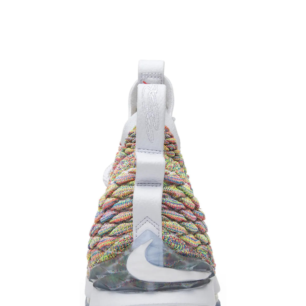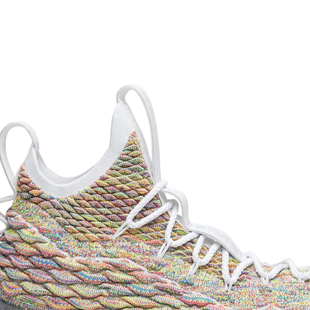 The Nike LeBron 15 'Fruity Pebbles' takes inspiration from the vivid hues of the Fruity Pebbles cereal box, showcasing a mix of bright, energetic tones across its Battleknit upper. The sneaker boasts an iridescent finish that reflects the playful, multi-colored elements of the cereal, with hits of orange, green, and purple spreading across the dynamic knit construction. The design incorporates a bold, eye-catching combination of premium materials, including a smooth, glossy midsole and a translucent outsole for a futuristic look. The signature Zoom Air cushioning in the forefoot and the Max Air unit in the heel deliver LeBron’s signature on-court comfort and support, making this sneaker as functional as it is stylish.