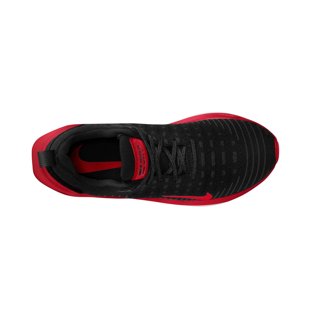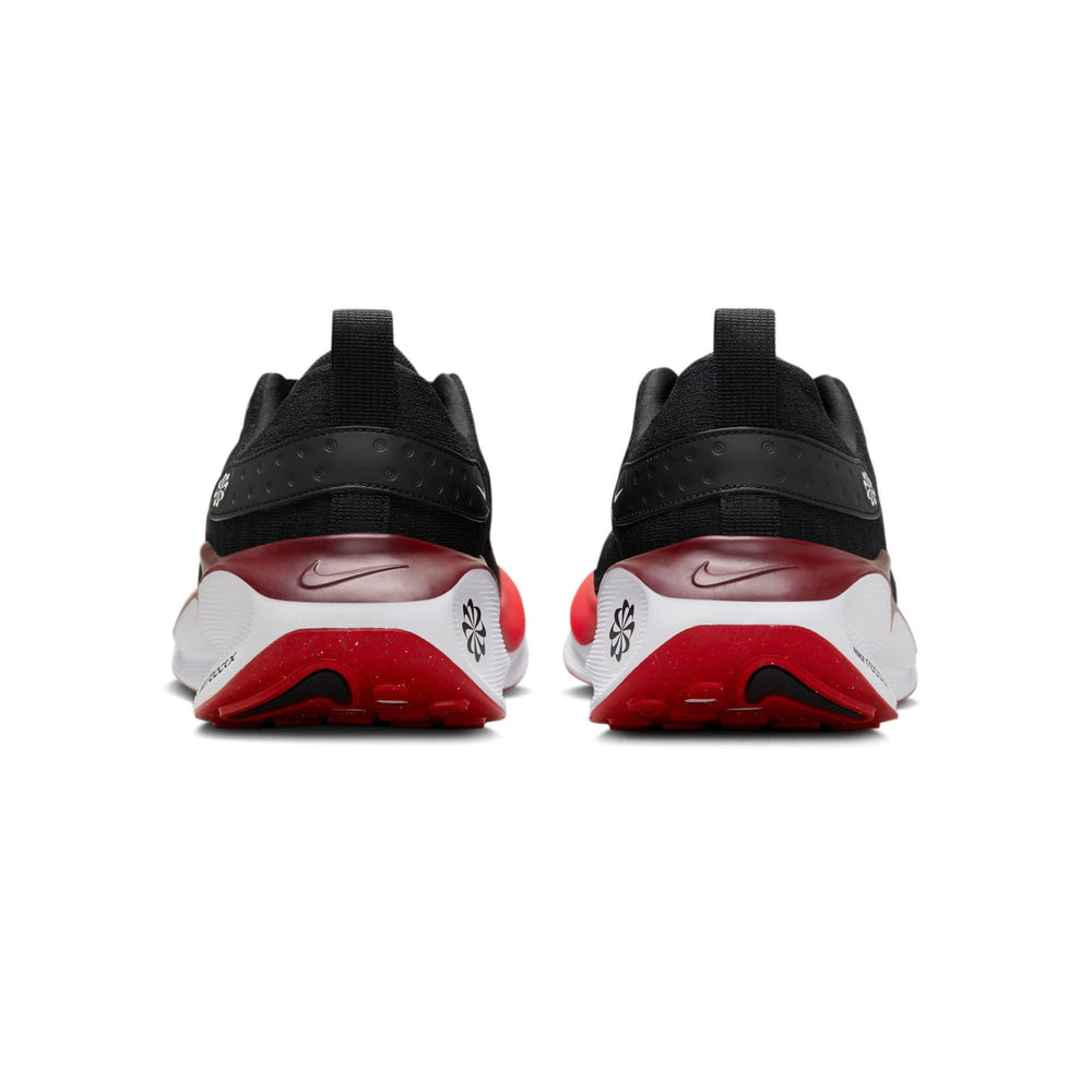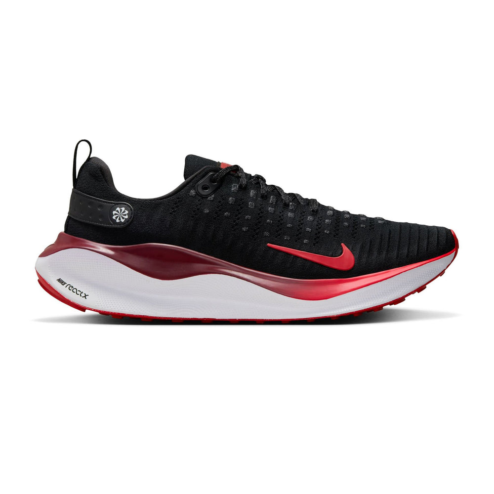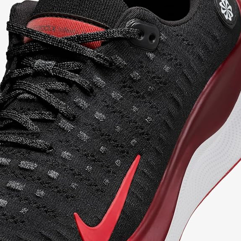 The Nike ReactX Infinity Run 4 'Black Fire Red' features a sleek black mesh upper with strategically placed synthetic overlays that enhance both durability and breathability. The shoe is highlighted by its striking Fire Red accents, which adorn the midsole, heel, and branding elements, providing a vibrant contrast to the predominantly dark design. The responsive Nike React foam midsole ensures a smooth, cushioned ride, absorbing impact and offering superior comfort during long runs. The shoe's updated rocker shape promotes a smooth stride, while its lightweight construction ensures that athletes can focus on performance without feeling weighed down. This model combines cutting-edge technology with a fresh, bold colorway to cater to the needs of runners who prioritize both style and substance.