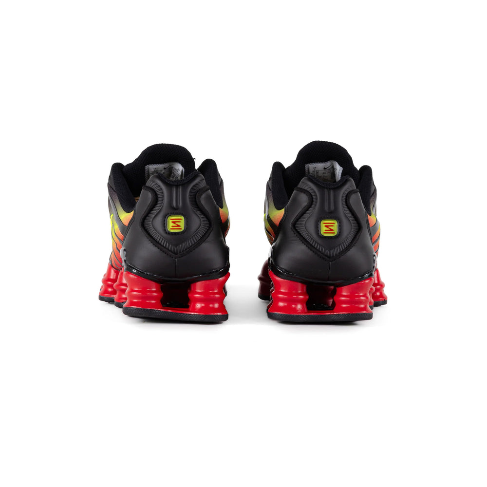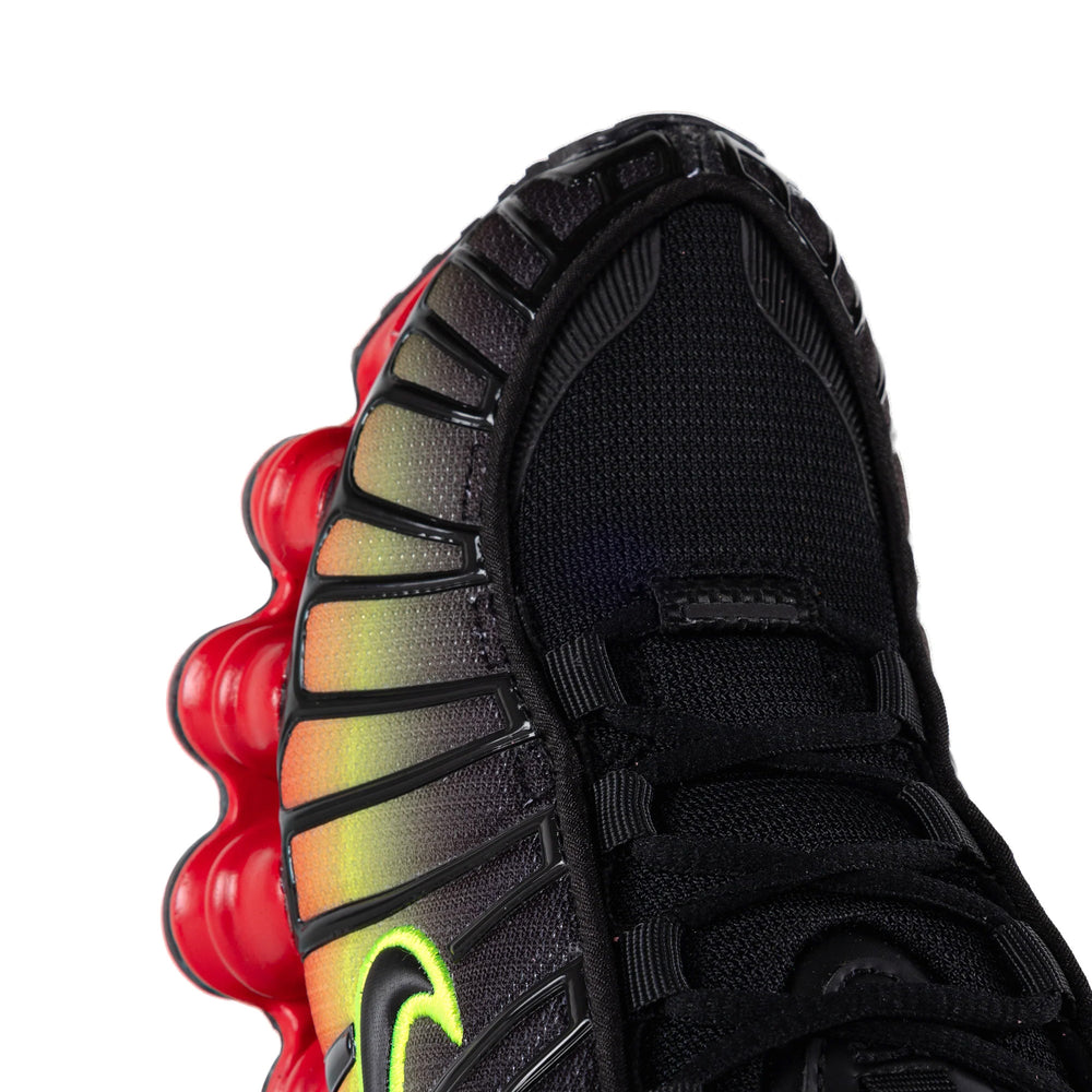 Featuring a vibrant 'Volt' colorway with 'Fire Red' accents, the Nike Shox TL stands out with its futuristic aesthetic. The sneaker showcases a mesh and synthetic upper that ensures breathability and support, while the distinctive Shox columns in the sole provide responsive cushioning and superior comfort. The 'Volt' hue dominates the design, highlighted by 'Fire Red' details on the laces, Swoosh branding, and heel tab. This high-energy color combination is complemented by reflective elements that enhance visibility and style. The sneaker’s performance is anchored by its robust Shox cushioning, engineered to offer both style and support for diverse activities.