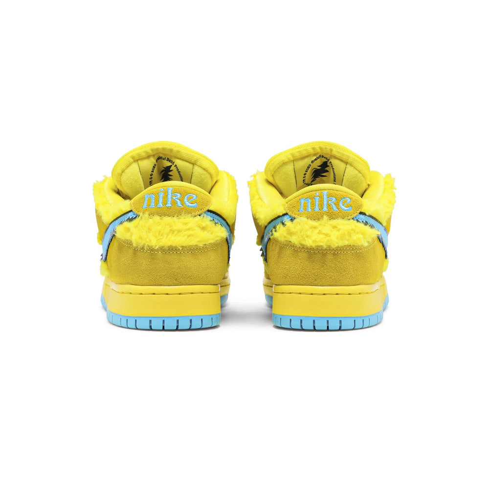 The upper of the SB Dunk Low Grateful Dead Bears Yellow is made of fluffy yellow fake fur, with suede overlays and a jagged Swoosh to mimic the stylized fur on a bear's breast. The tongue has a secret stash pocket that is ideal for extra storage. This ecstatic look is finished with a blue outsole, a yellow midsole, and the iconic Grateful Dead insignia on the tongue. In July 2020, these sneakers were on sale for $110 USD.