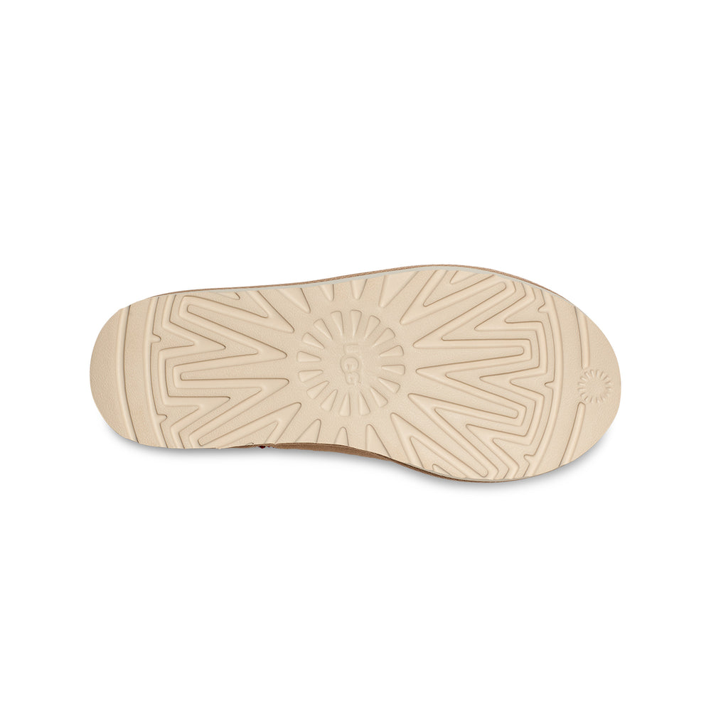 The UGG Tasman Slipper 'Sand Dark Cherry' showcases a soft "Sand" suede upper complemented by intricate "Dark Cherry" embroidery along the Tasman braid, a signature design element of the brand. The slipper is lined with UGG’s famous plush sheepskin, ensuring warmth and comfort for everyday wear. The lightweight yet durable Treadlite by UGG™ outsole adds functionality, making the slipper suitable for light outdoor use while maintaining its cozy indoor appeal. The minimalist design in muted tones is ideal for pairing with a variety of casual outfits, while the contrast of the "Dark Cherry" braid adds a subtle pop of color.