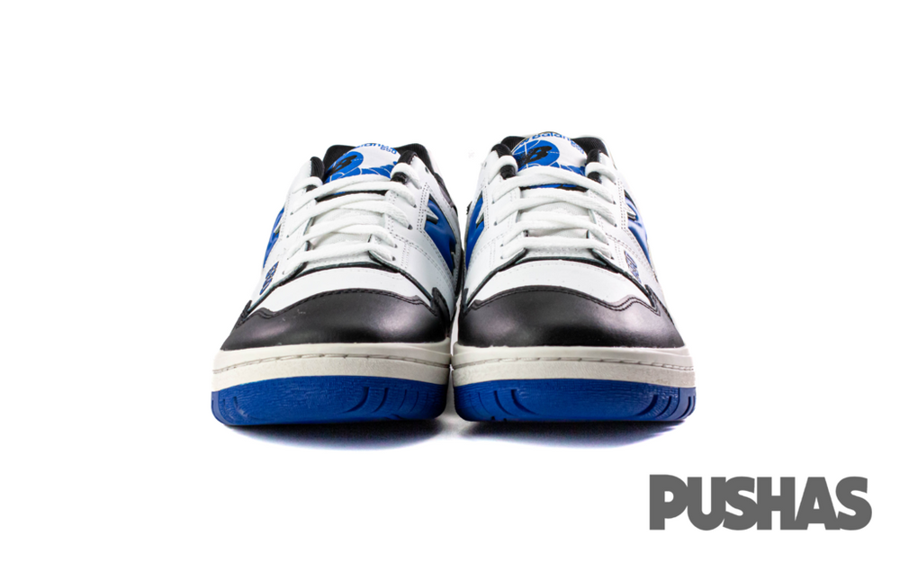 The top of the New Balance 550 White Royal Black is made of white leather, with royal blue and black overlays and accents. A puffy blue New Balance emblem on the quarter panel stands out against its white background. The design is then finished off with a woven New balance Basketball tongue label.