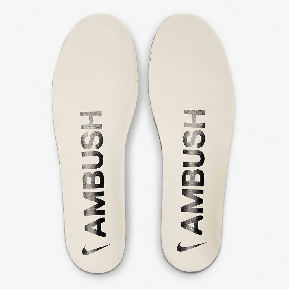 On their Air Force 1 collaboration, Ambush and Nike used an off-white Phantom colorway from top to bottom. In addition to the black AMBUSH branding on the tongue, lace-locks, and insoles, Nike incorporated an enormous black swoosh that protrudes from the heel.