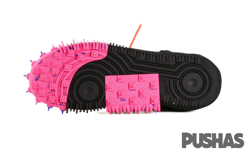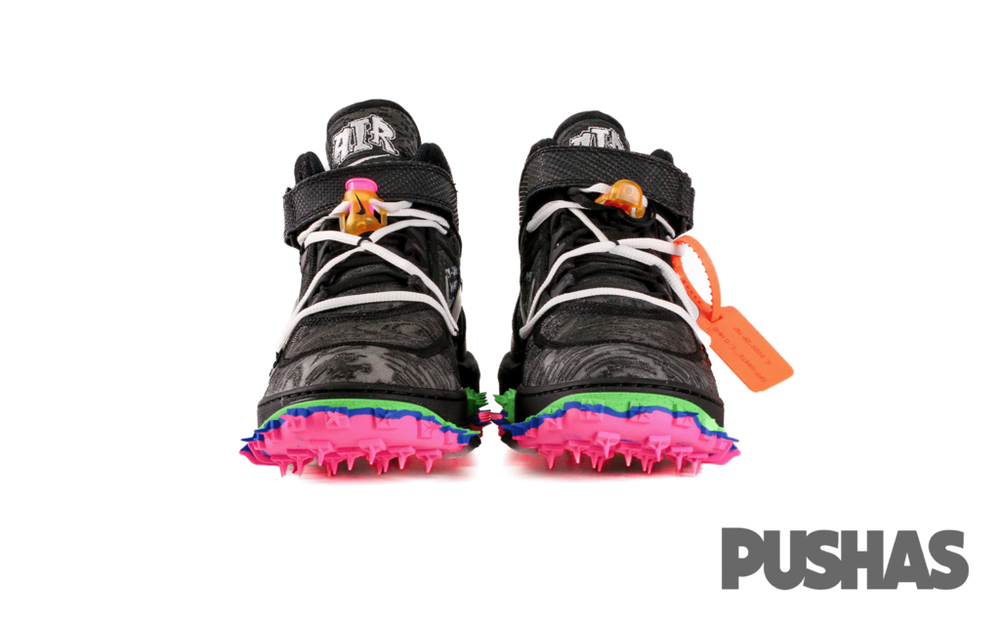 The Nike Air Force 1 Mid Off-White honors the 40th Anniversary of the Nike Air Force 1 by refreshing the classic design with Abloh's signature avante-garde style. It arrives with a black, wood grain-textured lightweight mesh upper with ripstop collar straps and clear TPU Swooshes. From there, a warped midsole with multi-colored sections of a track-inspired spiked outsole reference past Nike Off-White designs like the Nike Waffle Racer and Air Zoom Tempo Next%.