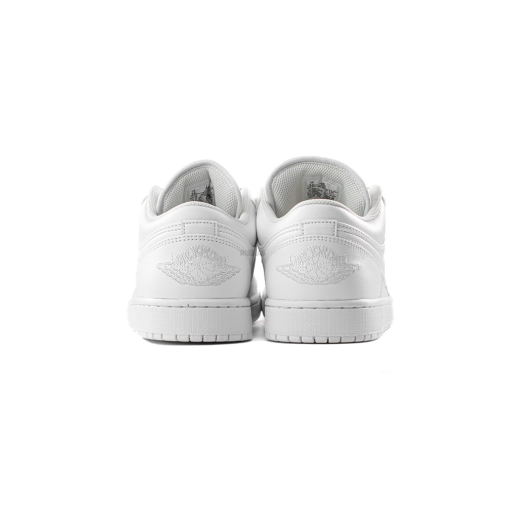 This Low Air Jordan 1's smooth white leather upper has white leather overlays, a white leather Swoosh, and toe box perforations. This shoe also has an Air-sole device in the heel and a white rubber cupsole. The white padded tongue sports a white debossed Jumpman, the white insole has a black Jumpman, and the white heel sports an embroidered white Wings logo.