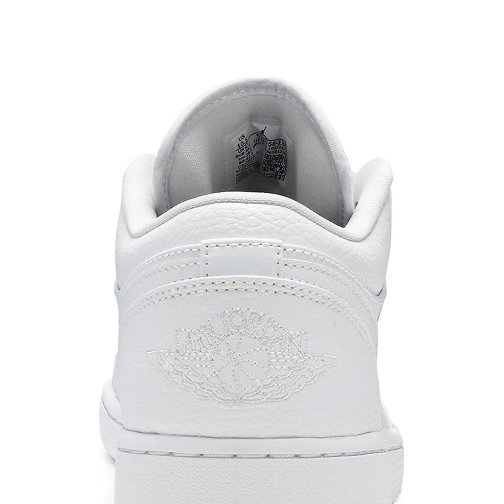 Crafted with premium tumbled leather, the Air Jordan 1 Low 'Triple White' features a monochromatic palette that exudes a clean and streamlined aesthetic. The high-quality leather ensures not only durability but also a luxurious feel, enhancing both comfort and style. The upper, entirely draped in white, is complemented by a matching midsole and outsole, creating a seamless look that is both understated and striking. The iconic Swoosh, also in white, blends effortlessly with the overall design, maintaining the sneaker's sleek silhouette.