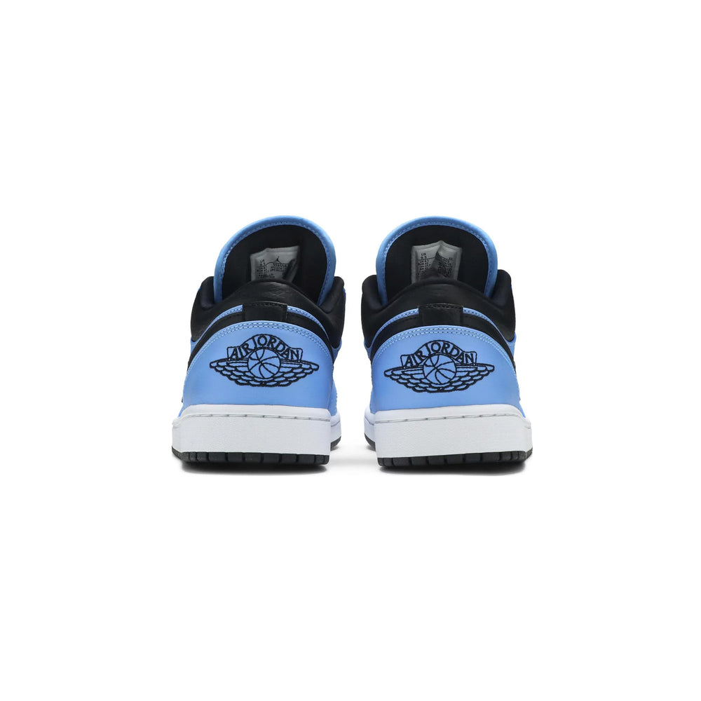 The Air Jordan 1 Low 'University Blue Black' features a smooth black nubuck base, providing a sleek backdrop for the vibrant “University Blue” leather overlays. The color contrast between the black and blue creates a striking visual effect, with the signature Nike Swoosh emblazoned in black leather across the side panels for a cohesive finish. The low-top silhouette is accented by a white midsole and a University Blue outsole, rounding out the design with a clean and sharp look. A woven tongue label featuring the Jumpman logo, along with the classic Air Jordan Wings logo on the heel, add to the sneaker’s traditional flair. Crafted for both style and comfort, this shoe is an ideal choice for casual wear or collectors looking for a versatile addition to their rotation.