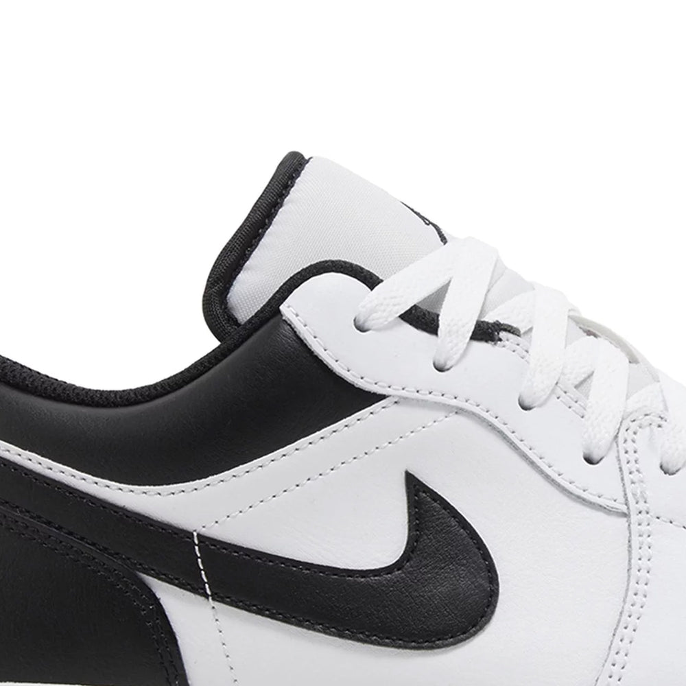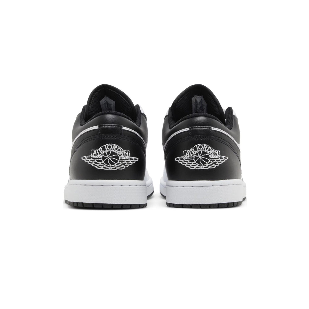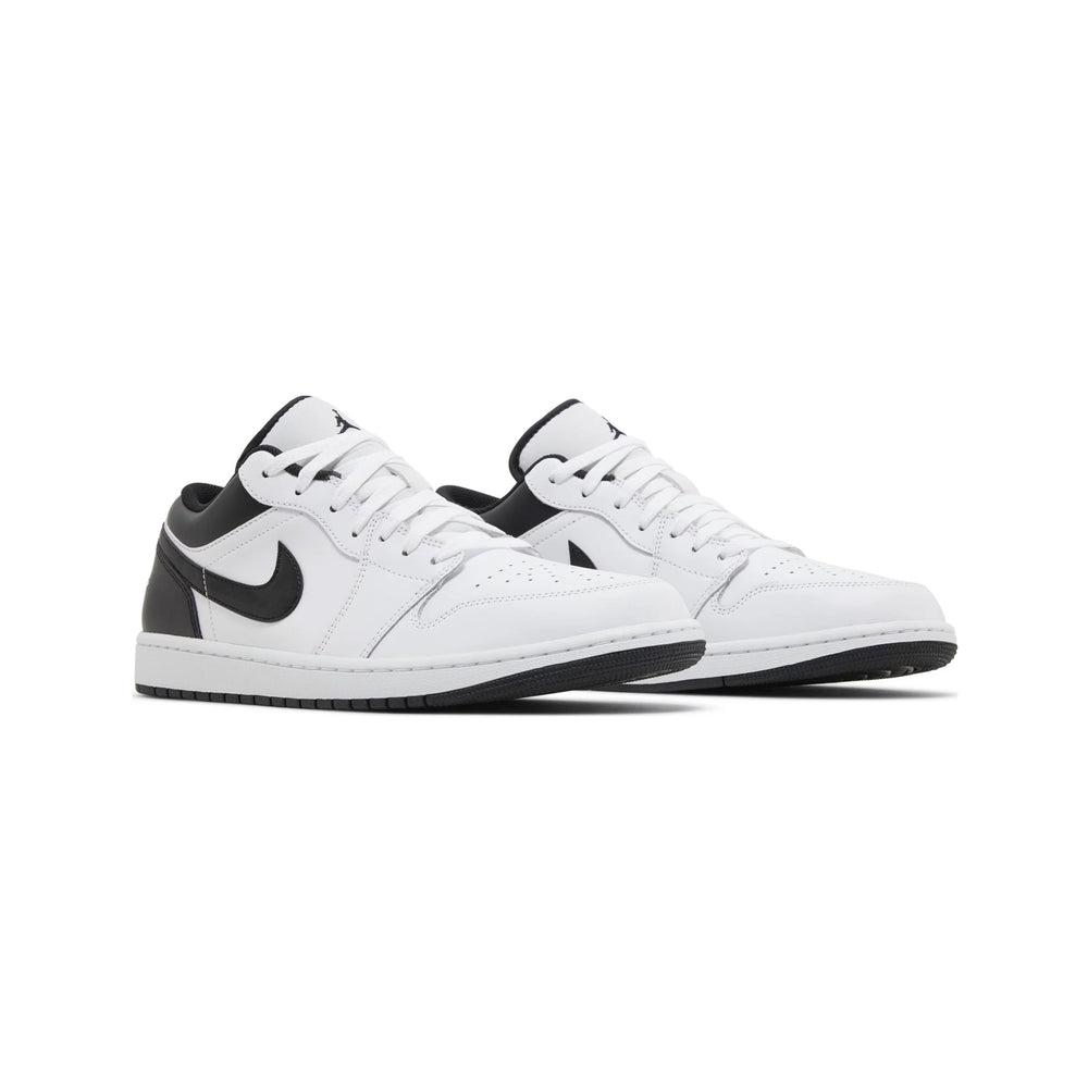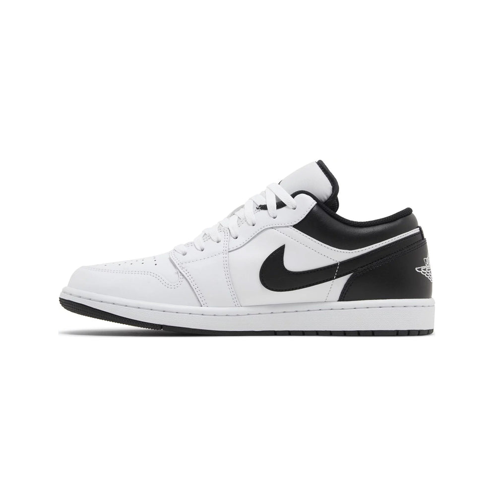 Crafted with a pristine white leather base, the Air Jordan 1 Low 'White Black' is accentuated by contrasting black overlays that enhance its streamlined profile. The upper features a clean, monochromatic palette, with the black leather Swooshes and Wings logo on the heel providing a striking contrast against the white background. The shoe is completed with a black tongue and laces, while the signature Nike Air branding on the tongue tag maintains the sneaker's classic aesthetic. Beneath, the black outsole offers both style and durability, ensuring longevity and comfort for everyday wear.