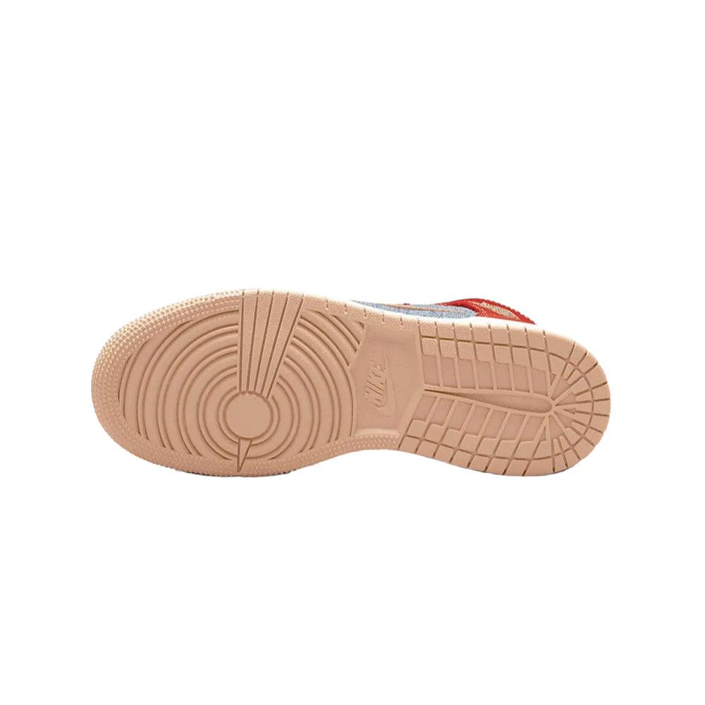 The Air Jordan 1 Mid 'Denim Red' GS features a striking combination of materials and colors that set it apart. The sneaker showcases a durable denim upper, contrasted by bold red accents that highlight the Swoosh, collar, and laces, creating a vibrant yet balanced look. The classic Air Jordan wings logo is prominently displayed on the ankle, paying homage to the brand's storied history. A white midsole and red outsole complete the design, offering both aesthetic appeal and functional grip. The padded collar and cushioned insole ensure a comfortable fit, making it suitable for all-day wear.