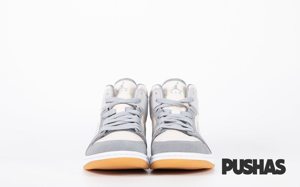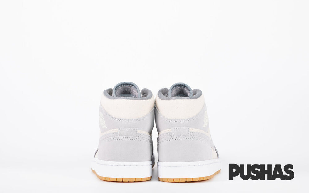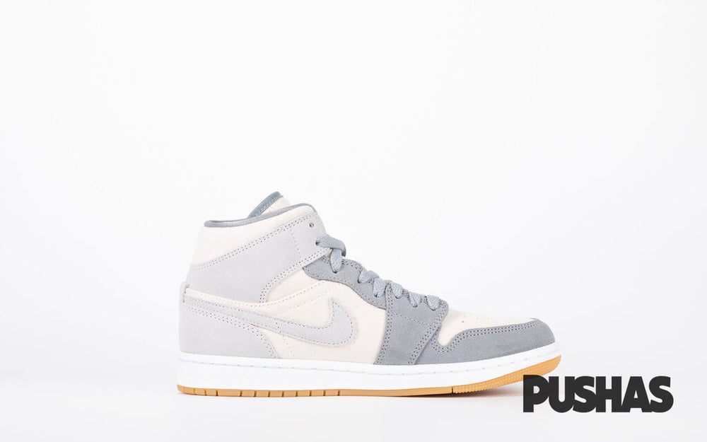 The Air Jordan 1 Mid SE 'Coconut Milk Particle Grey' (2021) has a canvas basis for its upper that features pops of Cream at the collar, toe box, and quarter. Dark grey is used for the toe cap and mudguard, whereas light grey is used for the smoosh, collar flap and cupsole.