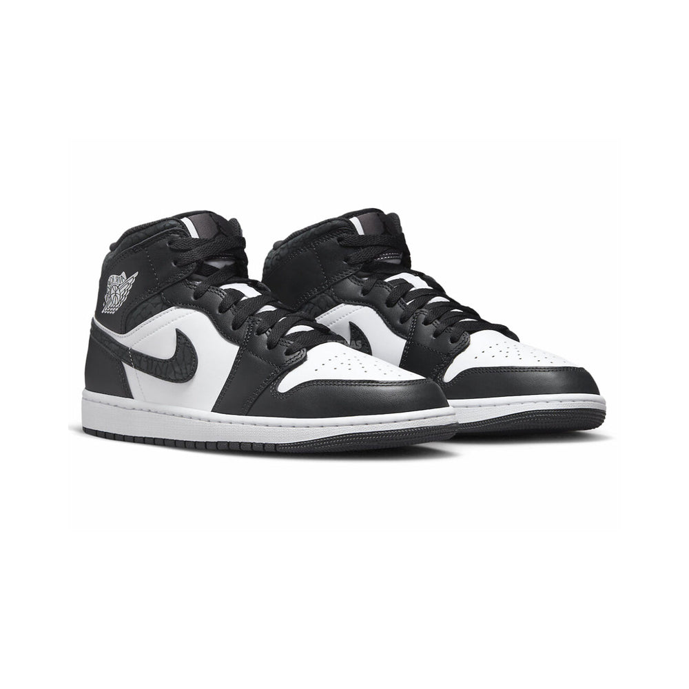 The 'Panda Elephant' colorway features a unique blend of black and white, creating a striking contrast reminiscent of the black and white fur pattern of a panda. The leather upper is adorned with elephant print overlays, adding a textured and distinctive touch that sets these Jordans apart. The mid-top silhouette offers ankle support and a fashion-forward look that easily transitions from the courts to the streets.