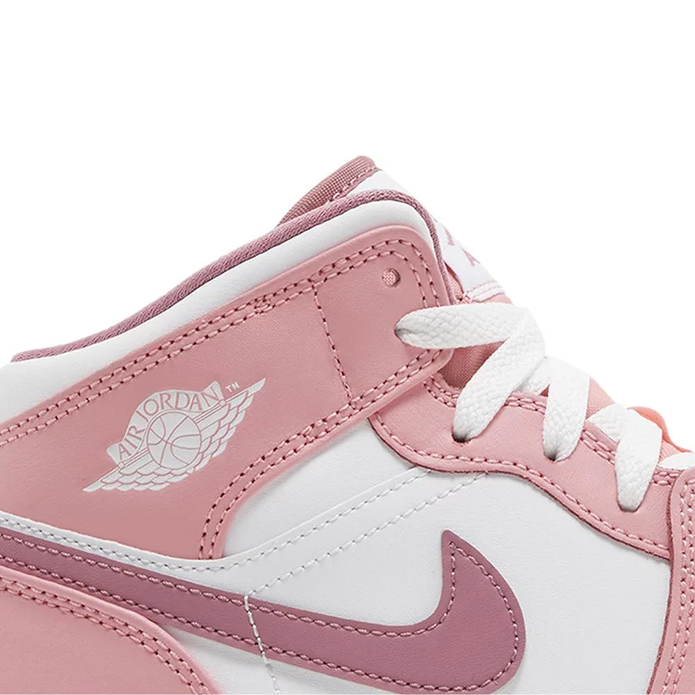 Crafted with a smooth white leather base, the Air Jordan 1 Mid 'Valentine's Day' GS (2023) features striking overlays of vivid pink and fuchsia. These rosy hues evoke the celebration of love, while the signature Swoosh is displayed in a shimmering metallic red, giving the sneaker a vibrant contrast. The midsole is pure white, sitting atop a light pink outsole that completes the festive look. Further enhancing the Valentine’s theme are small heart-shaped details subtly integrated into the design, making this a perfect pair for the holiday and beyond. With its mix of quality materials and distinctive color palette, this release offers a fresh, seasonal take on a timeless model.