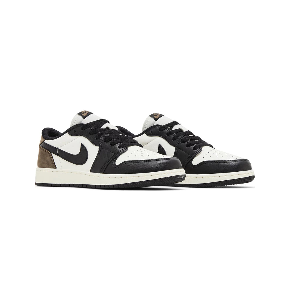 The Air Jordan 1 Retro Low OG 'Mocha' GS features a refined "White" leather base complemented by rich "Mocha" suede overlays. This combination of textures enhances the shoe's premium feel and visual appeal. The iconic Swoosh and Wings logo on the heel are rendered in contrasting "Black," creating a sharp, standout effect. Notable for its minimalist elegance, the sneaker includes classic details such as perforated toe boxes for breathability and a clean white midsole that provides a striking contrast against the darker tones of the upper. The "Mocha" colorway is inspired by the earthy tones often seen in classic and contemporary design, making it a versatile choice for various styles and occasions.