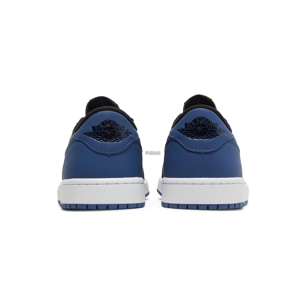 The Air Jordan 1 Low Mystic Navy features the same color blocking and details as the original 1985 Air Jordan 1 line. It is constructed of smooth leather in black and Mystic Blue. A vintage Jordan Wings emblem on the heel honors the design's heritage. The design is finished off with an Air sole in white and Mystic Navy.