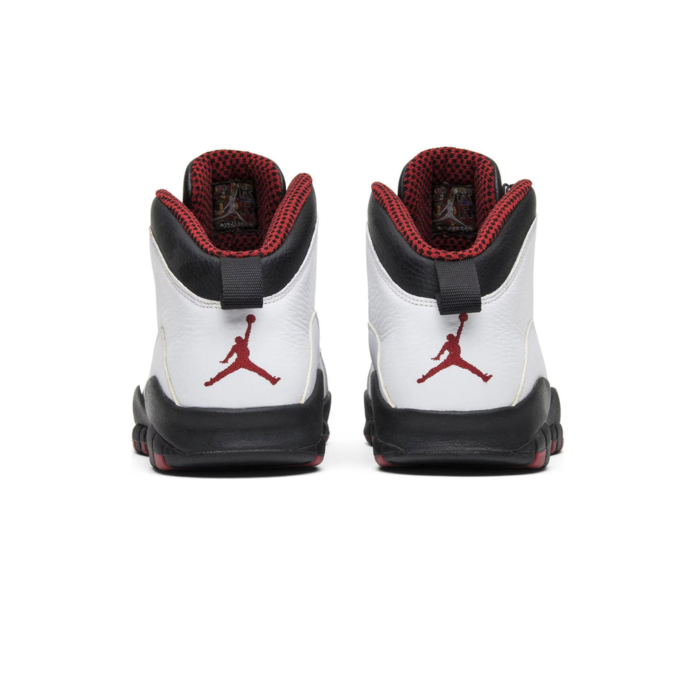 Crafted with a premium white leather upper, the Air Jordan 10 Retro 'Chicago Bulls' (2012) is accentuated by striking black and red details, a nod to the Chicago Bulls' team colors. The silhouette features black leather eyestays and a midsole that offer a stark contrast to the clean white upper. Red accents on the collar lining and outsole, emblazoned with Michael Jordan's notable career achievements, add a vibrant touch that celebrates the legend's journey and success.
