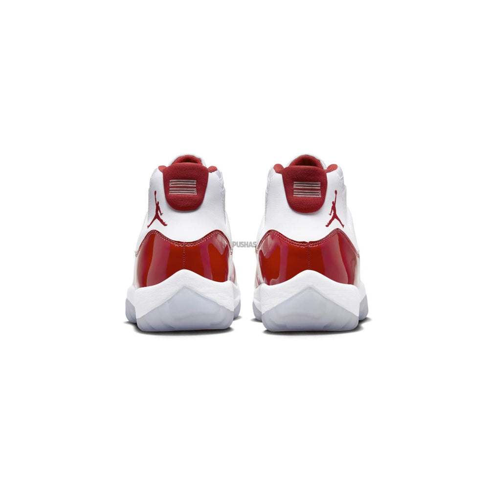 The Air Jordan 11 Retro 'Cherry' features a premium white leather upper with patent leather overlays in a vibrant 'Cherry' red hue, reminiscent of the original 1996 design. This striking colorway, coupled with the shoe's signature translucent outsole and carbon fiber shank plate, captures the essence of luxury and performance synonymous with the Air Jordan line.