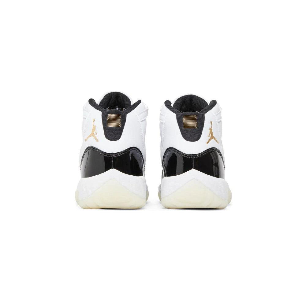 Crafted with meticulous attention to detail, the Air Jordan 11 Retro 'DMP Gratitude' GS showcases premium materials and expert craftsmanship. The iconic patent leather upper, in a sleek black colorway, exudes sophistication and style, while the contrasting metallic gold accents add a touch of luxury. The signature translucent outsole completes the classic yet contemporary look, making these sneakers a standout addition to any collection.