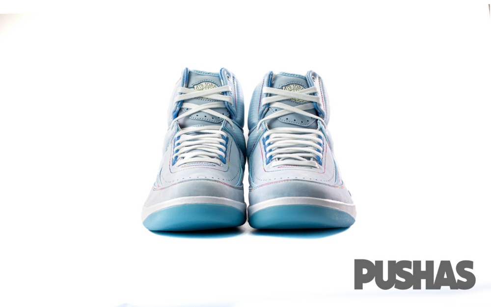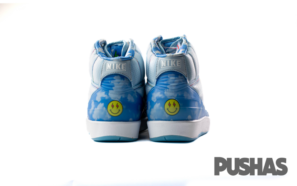 This offering of the J Balvin x Air Jordan 2 features a padded-style upper with LED detailing and glow-in-the-dark rubber outsole. Other details includes cloud graphics on the heels and lining, personal branding on the inner tongues and signature smiley face motif on the heels.