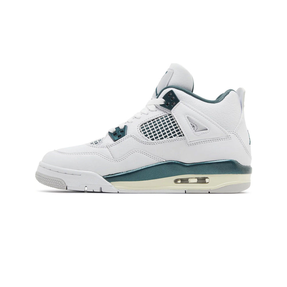 The Air Jordan 4 Retro 'Oxidized Green' GS features a premium leather upper, predominantly in a clean white hue, creating a striking contrast with the titular 'Oxidized Green' accents. These green details, reminiscent of patinated copper, gracefully highlight the eyelets, midsole, and heel tab, giving the sneaker a modern yet timeless appeal. The black mesh underlays and support wings provide a bold contrast, enhancing both the visual depth and structural integrity of the shoe. Additionally, the sneaker's silhouette is completed with a visible Air-Sole unit in the heel and a lightweight, cushioning midsole, ensuring maximum comfort and performance.