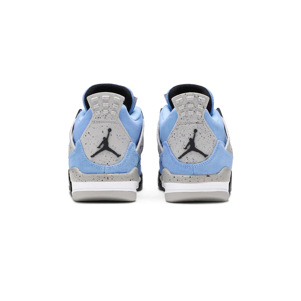 The Air Jordan 4 Retro 'University Blue' GS (2021) features a rich suede upper in a striking "University Blue" color, reminiscent of the Tar Heels' classic uniforms. Contrasting black netting on the midfoot, along with black eyelets and a black heel tab, offers a sharp balance to the vibrant blue. Cement grey detailing on the midsole and heel panel, speckled with black, adds a signature AJ4 touch, paying homage to the original colorways of the Air Jordan 4 lineage. The Jumpman logos on the tongue and heel complete the sneaker’s aesthetic, while the visible Air cushioning in the sole ensures comfort and support for all-day wear.