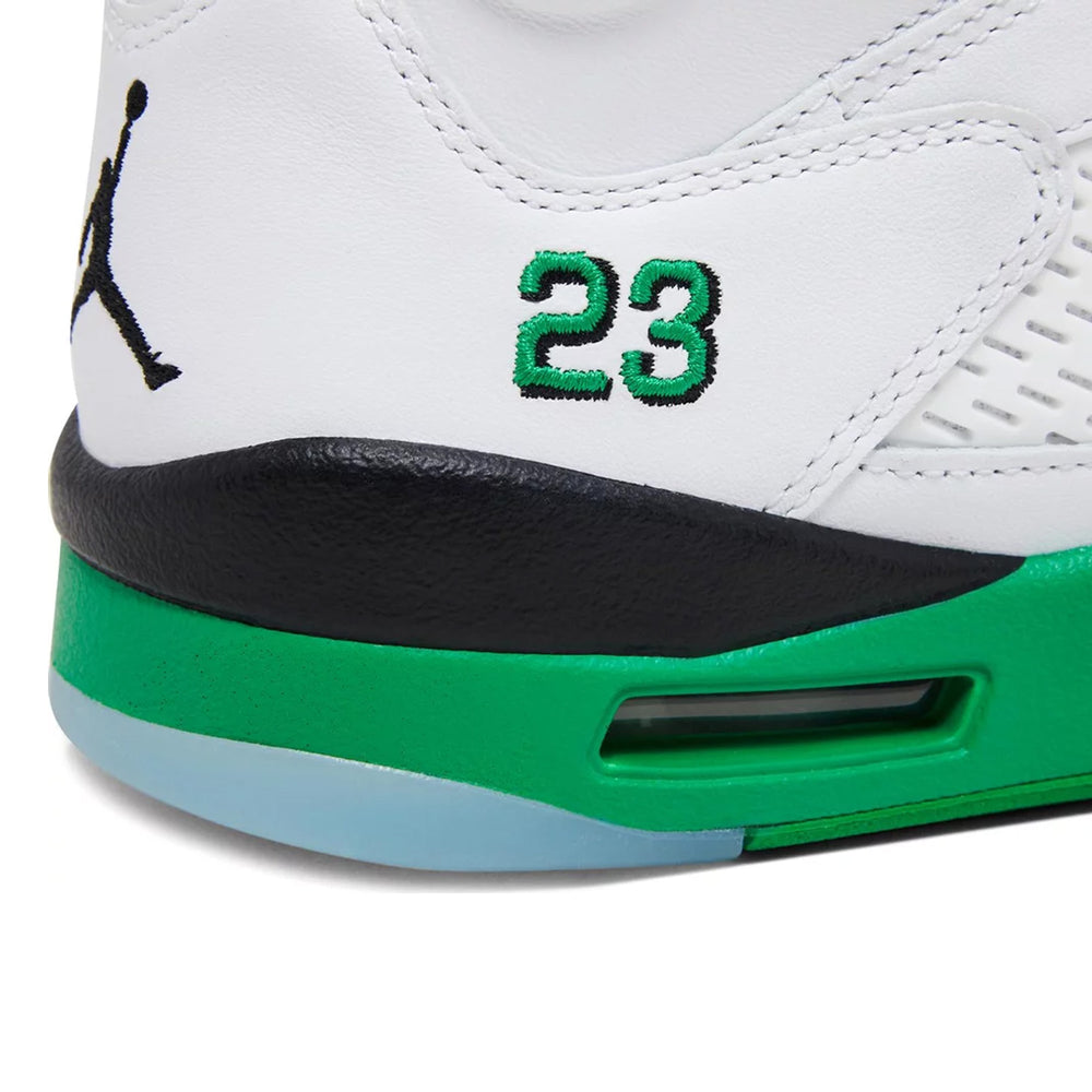 Crafted with a premium white leather upper, the Air Jordan 5 Retro 'Lucky Green' Women's showcases a bold "Lucky Green" hue that extends across the midsole, inner lining, and the signature shark-tooth detailing, a nod to the fighter jet inspiration behind the original design. The translucent mesh side panels and tongue, along with the 3M reflective tongue, enhance the sneaker’s futuristic appeal. A touch of black on the midsole and laces adds contrast, grounding the vibrant green and providing a balanced aesthetic. The Jumpman logo on the tongue and heel is embroidered in black, maintaining the classic branding synonymous with the Air Jordan series. The icy blue translucent outsole not only offers traction but also elevates the overall design with a modern touch.