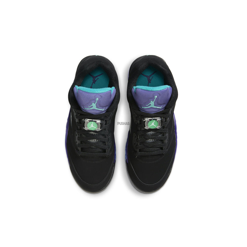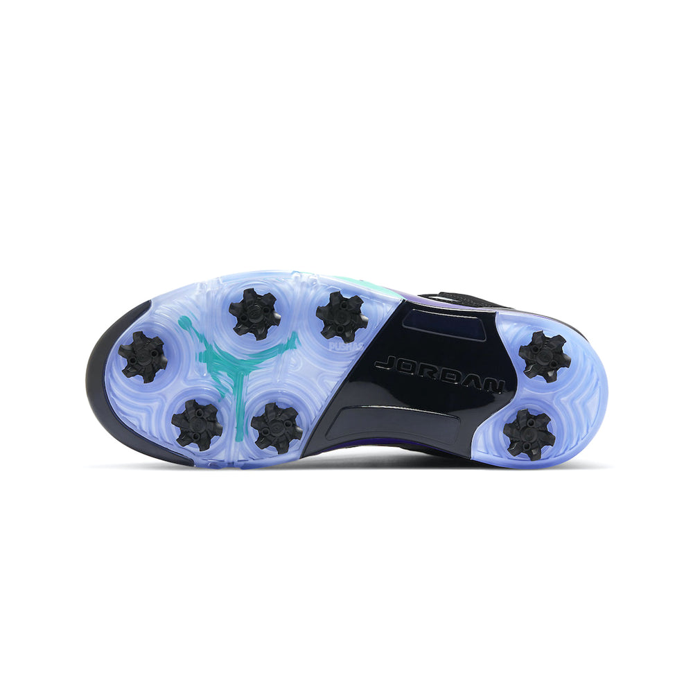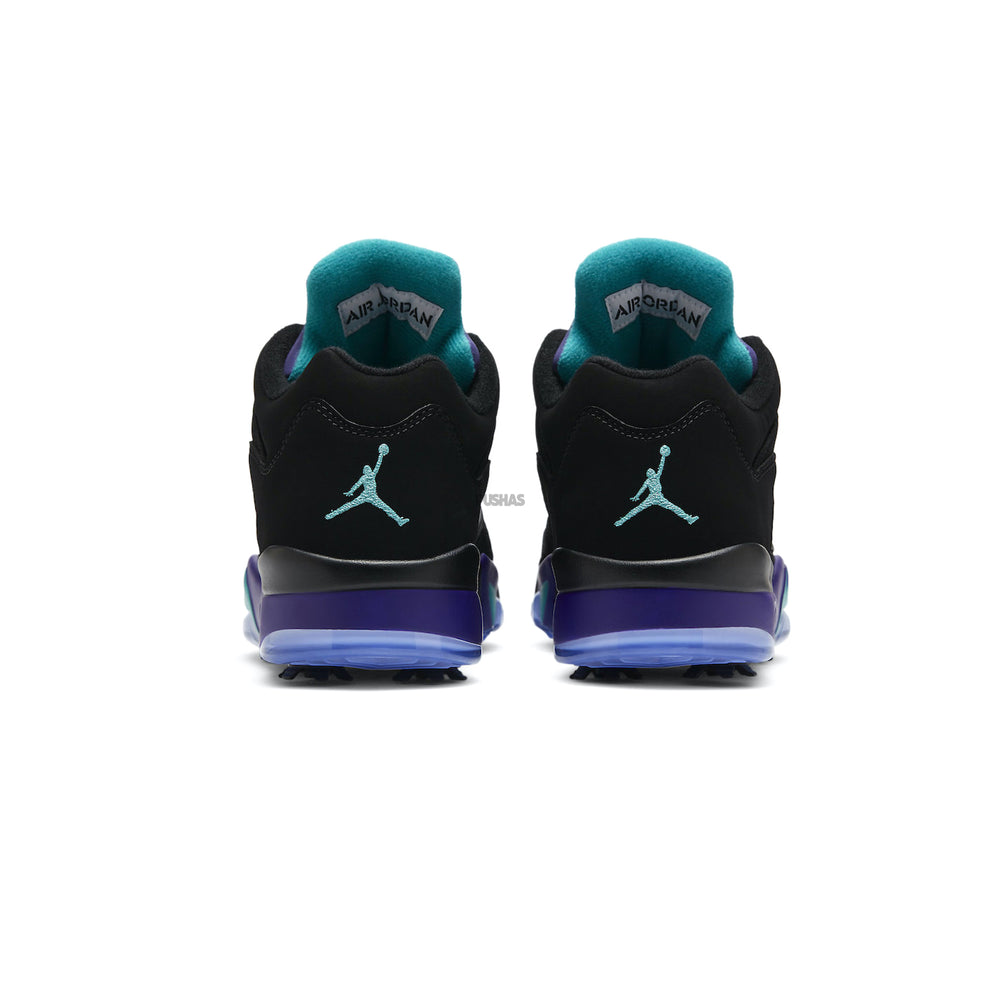 Introducing the epitome of style and performance on the green: the Air Jordan 5 Retro Low Golf 'Black Grape' (2020). Crafted with the precision and innovation synonymous with the Air Jordan brand, this golf shoe seamlessly blends iconic design with cutting-edge technology for the ultimate golfing experience. Paying homage to the classic 'Black Grape' colorway, this iteration features a sleek black upper with pops of grape and emerald accents, delivering a look that exudes sophistication and flair.