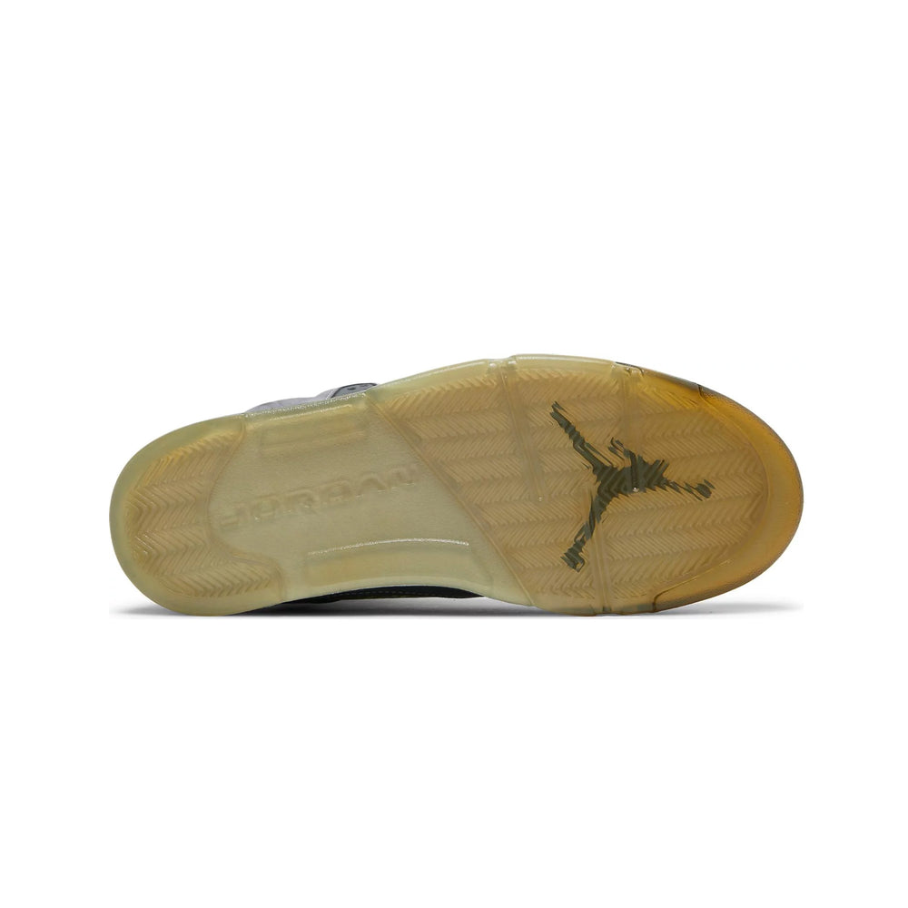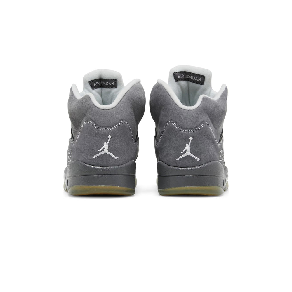 The Air Jordan 5 Retro 'Wolf Grey' also features white contrast stitching, highlighting the contours and construction of the shoe, while the clear lace lock system enhances the secure fit and unique aesthetic. The midsole is accentuated with speckled 'shark teeth,' a signature detail inspired by World War II fighter planes, adding an edge of boldness and historical significance.