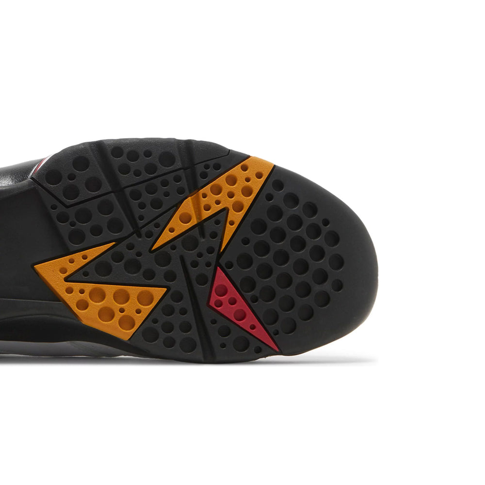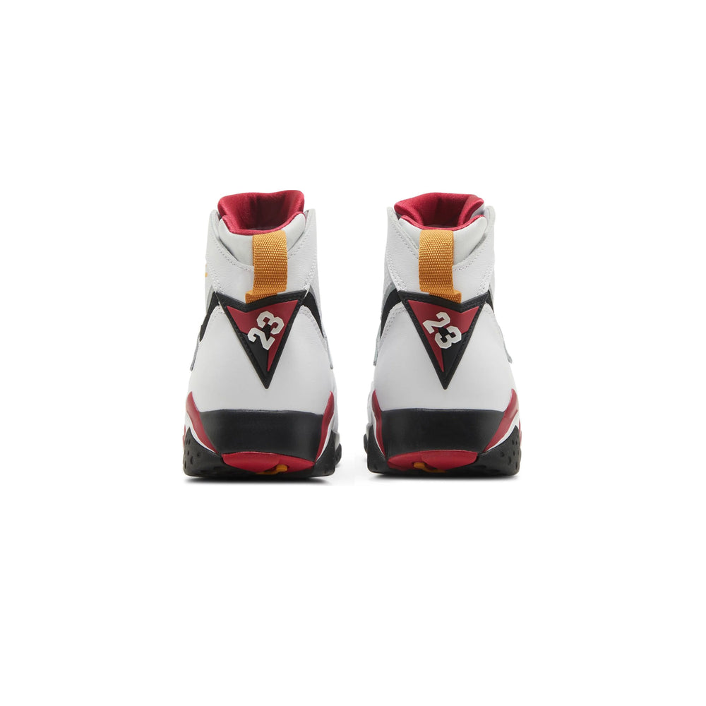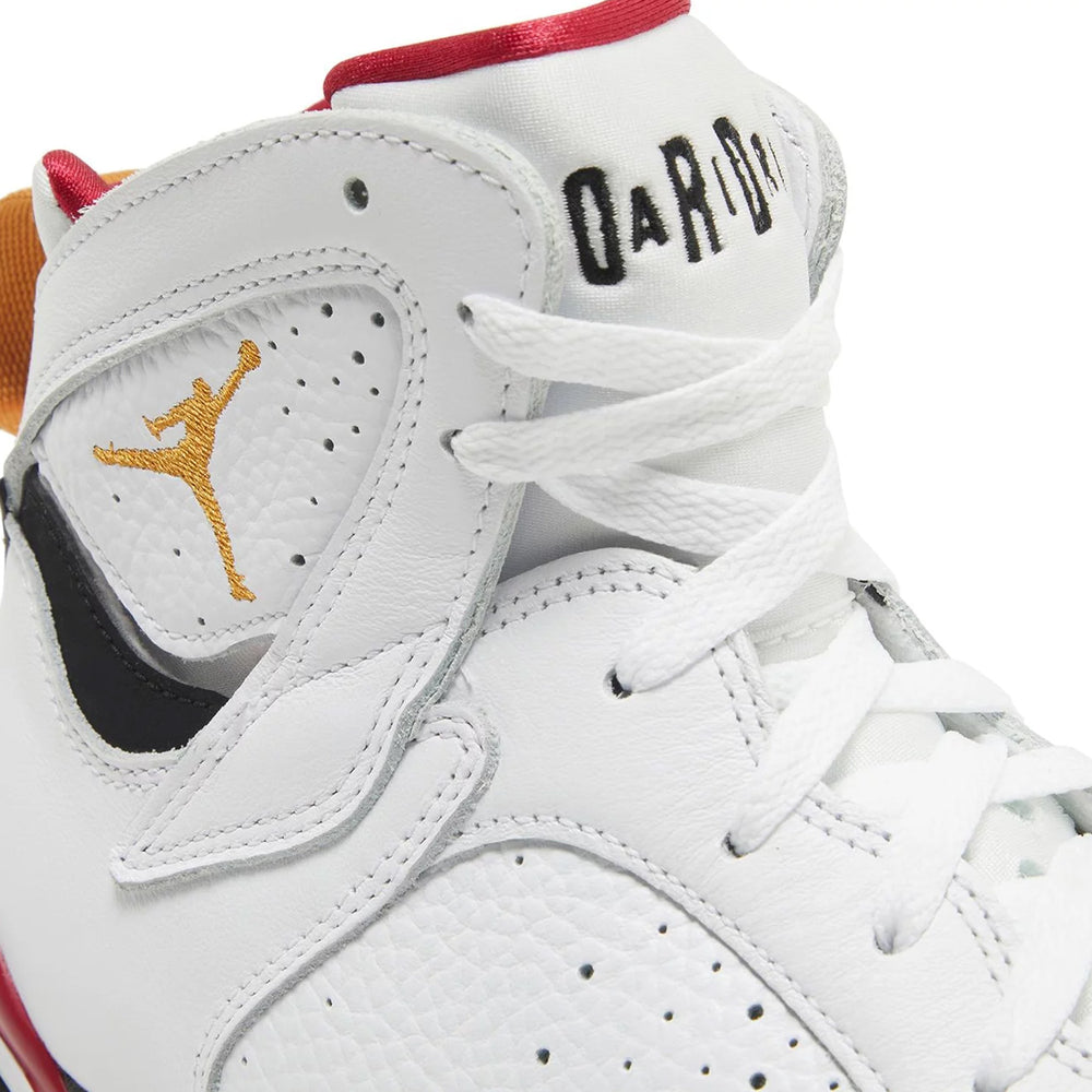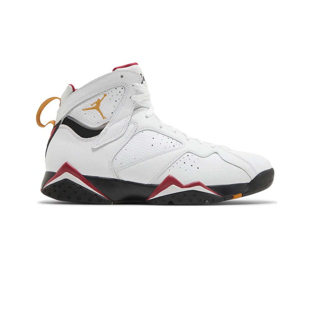 Crafted with a premium white leather upper, the Air Jordan 7 Retro 'Cardinal' features distinctive perforations that enhance breathability and comfort. The signature Huarache-style inner bootie provides a snug fit, while the midsole's dynamic sculpting and visible Air-Sole unit in the heel deliver unparalleled cushioning. Bold accents of cardinal red and bronze on the midsole, heel tab, and Jumpman logo punctuate the design, paying homage to the original colorway. The sneaker is completed with a black outsole that provides traction and durability, ensuring that style is met with functionality.