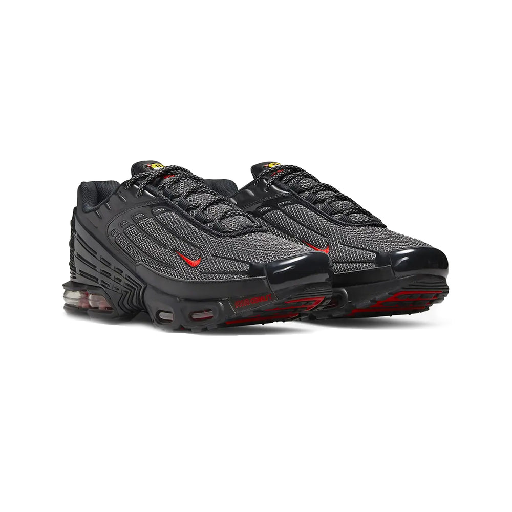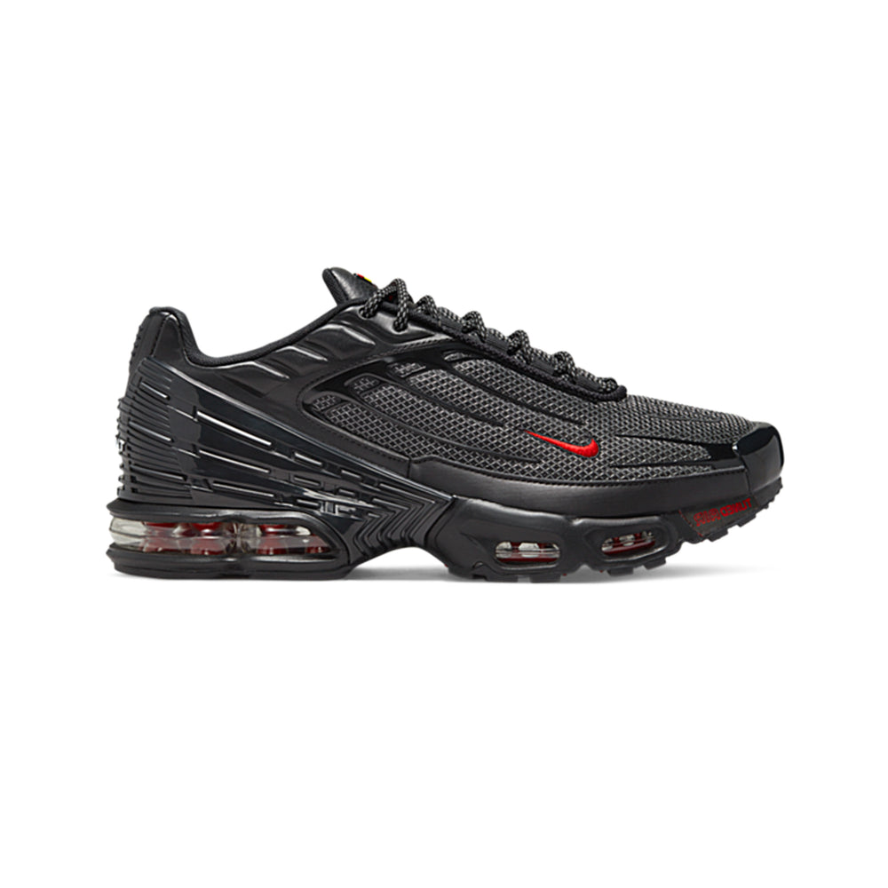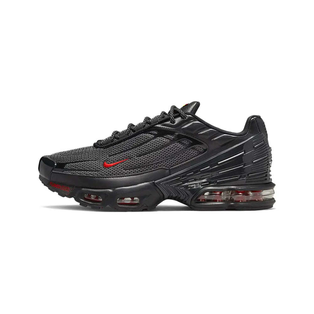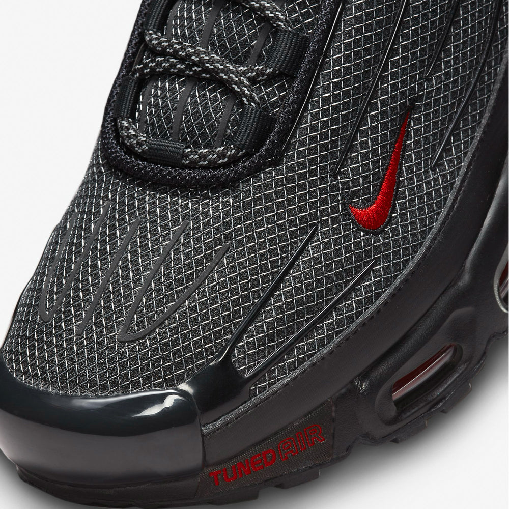Crafted with a sleek black mesh upper, the Nike Air Max Plus 3 'Black Reflective Silver University Red' is punctuated by reflective silver accents that enhance visibility and add a futuristic edge. The dynamic design is further elevated by vibrant University Red detailing on the signature Tuned Air units and branding elements. The sneaker's design pays homage to the original Air Max Plus but introduces a modern twist with its aerodynamic lines and superior cushioning.