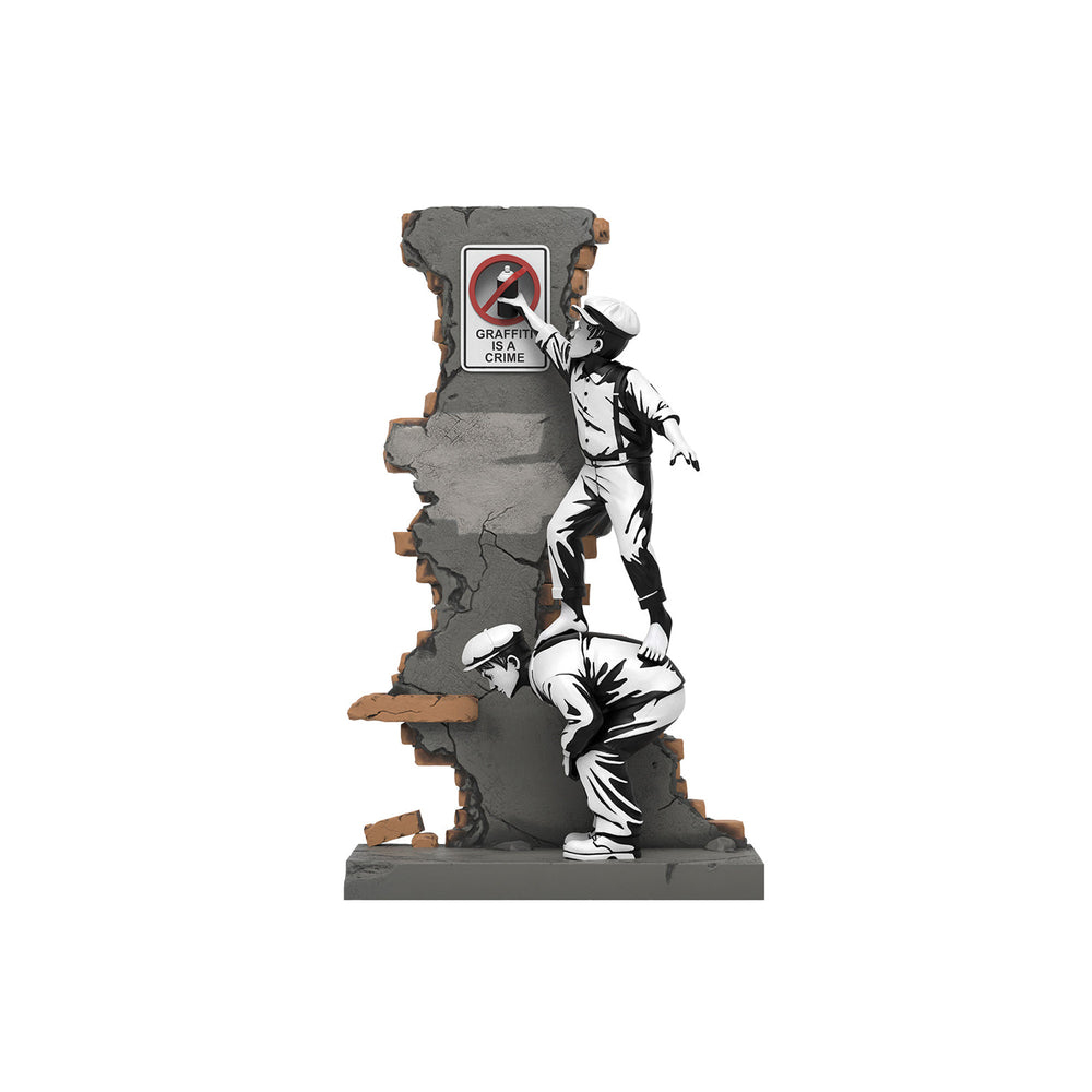 The Mighty Jaxx Brandalised 'Graffiti Crime' features a detailed interpretation of Banksy's celebrated graffiti style, crafted into a limited-edition art piece. The sculpture mirrors the street artist’s original work, portraying a young vandal caught mid-act, spray can in hand, perfectly encapsulating the daring defiance of urban graffiti. Every detail, from the artistically rendered brick wall backdrop to the figure’s expression of innocence and rebellion, pays homage to the disruptive nature of street art. Crafted from premium vinyl, the collectible stands as a reflection of Mighty Jaxx’s dedication to quality and artistry. This piece not only celebrates Banksy's vision but also challenges traditional perceptions of art and crime, making it a must-have for modern art enthusiasts.