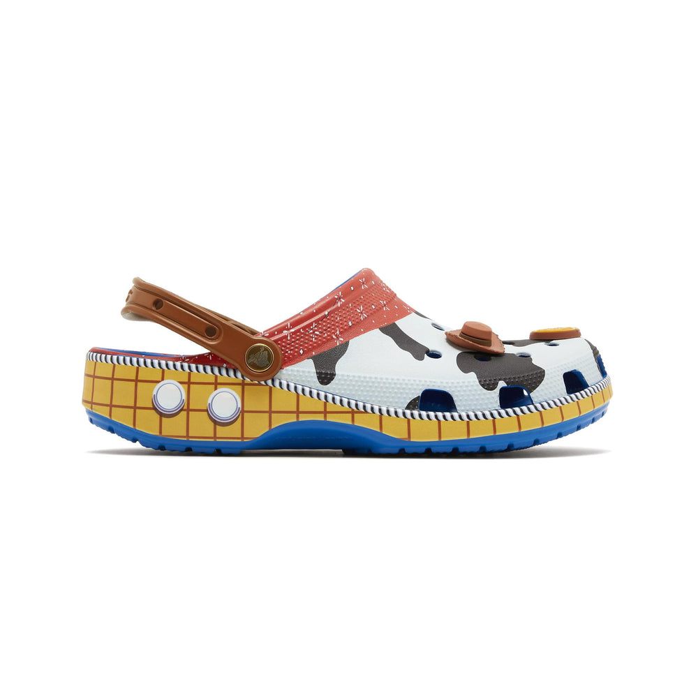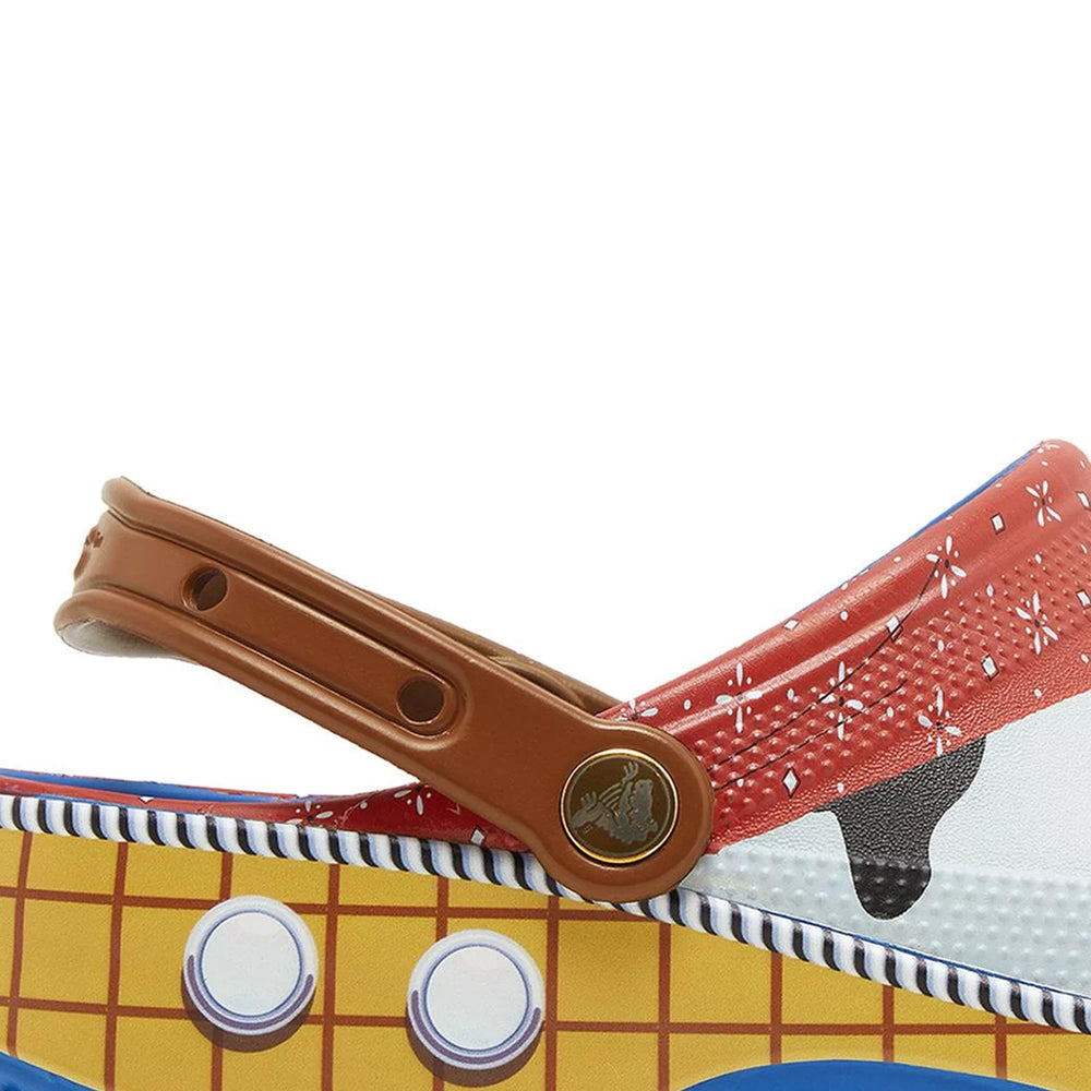 The Crocs Classic Clog x Toy Story 'Woody' (2024) features a distinctive design inspired by Woody’s iconic outfit. The clogs are adorned with a vibrant yellow base, echoing Woody's signature shirt, while the blue heel strap reflects the denim of his jeans. The standout feature is the detailed sheriff badge Jibbitz charm on each clog, a nod to Woody's role in the Toy Story series. The clogs are further accented with brown and red details, mirroring Woody's hat and bandana, creating a cohesive and instantly recognizable aesthetic.