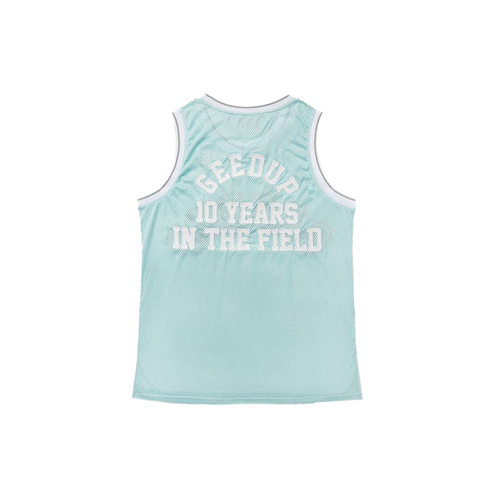 Crafted from a premium blend of polyester and mesh, the Geedup College Logo B-Ball Jersey 'Aqua' offers superior breathability and comfort, ideal for both on-court performance and casual wear. The vibrant aqua colorway is complemented by contrasting white accents, including the iconic Geedup logo emblazoned across the chest, adding a touch of bold sophistication. The jersey features a traditional V-neck design and wide armholes, ensuring ease of movement and a relaxed fit. The reinforced stitching enhances durability, making this jersey a reliable choice for long-term use. This piece not only pays homage to the timeless basketball jersey silhouette but also elevates it with modern touches, appealing to both sports enthusiasts and fashion-forward individuals.