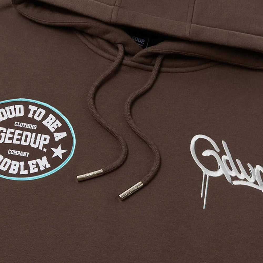 Embrace a bold statement with the Geedup Proud To Be A Problem Hoodie 'Brown / Light Blue'—where comfort meets uncompromising style and individuality is celebrated.