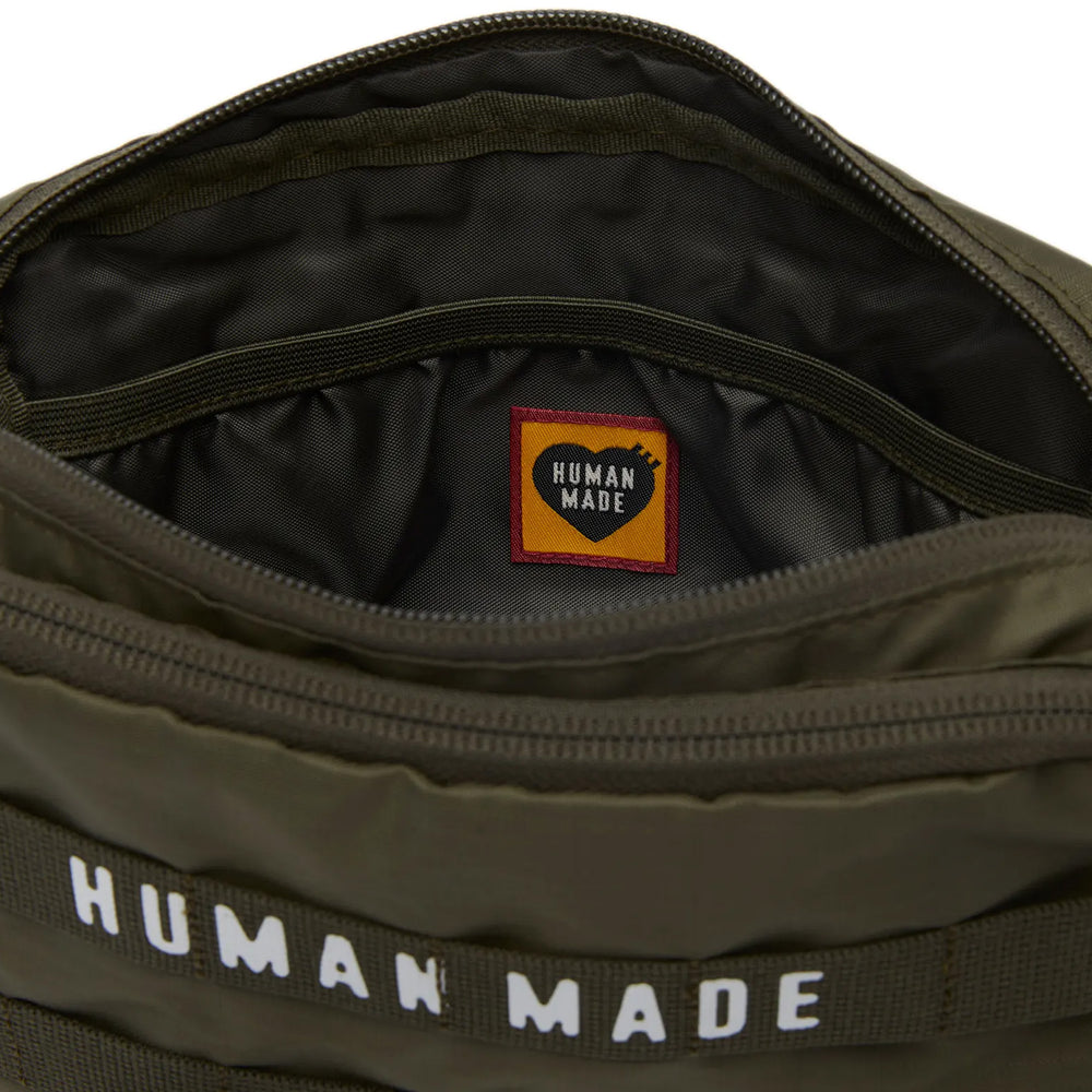 The 'Olive Drab' colorway of the Human Made Military Light Shoulder Pouch is a nod to classic military gear, combining rugged durability with contemporary style. Constructed from high-quality, water-resistant nylon, this shoulder pouch ensures your essentials remain protected regardless of the weather. The design features a spacious main compartment with a secure zip closure, complemented by an external zip pocket for easy access to smaller items. The adjustable shoulder strap allows for a customized fit, making it versatile for various carrying preferences. Embellished with the iconic Human Made heart logo on the front, this pouch stands out as a symbol of premium craftsmanship and streetwear culture.