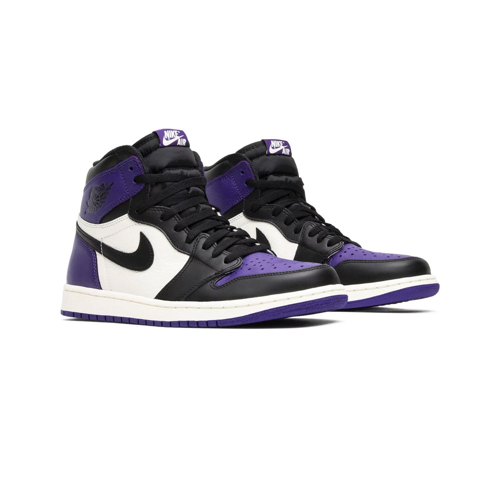 These sneakers feature a spectacular pop of color with a leather upper in black, sail, and court purple. The Air Jordan 1 Retro, which shares characteristics with the "Bred Toe," sports a black "Swoosh," a white midsole, and a court-purple sole.