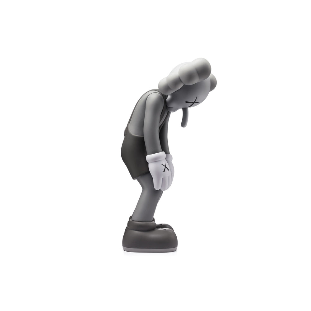 Buy the KAWS Small Lie Companion Vinyl Figure 'Grey' (2017) In December 2017, KAWS unveiled "Small Lie," a new iteration of his iconic sidekick. The sculpture depicts the companion stooped over in what looks to be a dejected posture and sporting a long, Pinocchio-like nose. This figurine was distinct from the Open Edition Companions in that the character wore overalls, and it did not come in flayed variations. This Small Lie Companion in Gray features a range of grey hues with black accents on the artist's iconic hand and eye motifs. The diminutive version of the small lie companion, which originally appeared as a 30-foot-tall African hardwood monument at the Yorkshire Sculpture Park in the United Kingdom, is now accessible. Measurements: 11 X 5 X 4.5 IN / 27.9 X 12.7 X 11.4 CM Condition: Brand New
